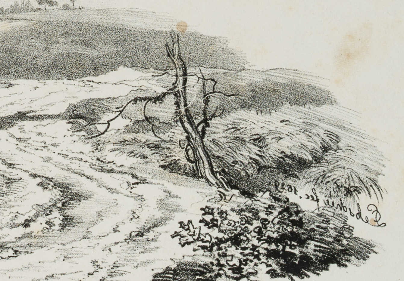 Carl August Lebschée (1800 Schmiegel – 1877 München), Landschaftsstudie mit kahlem Baum, 1829, Lithographie