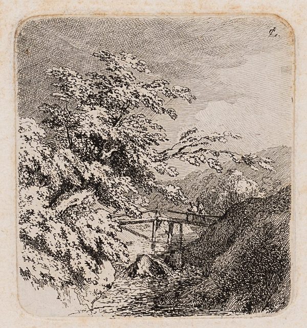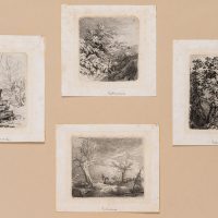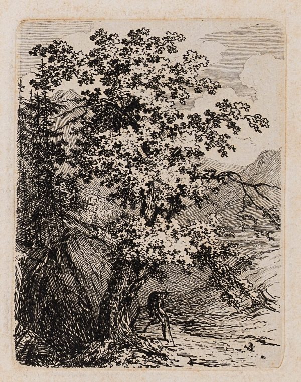 Carl August Lebschée (1800 Schmiegel – 1877 Munich), Four landscapes with figures, motifs of a hiking tour, probably Upper Bavaria or Franconia, c. 1850, Etching