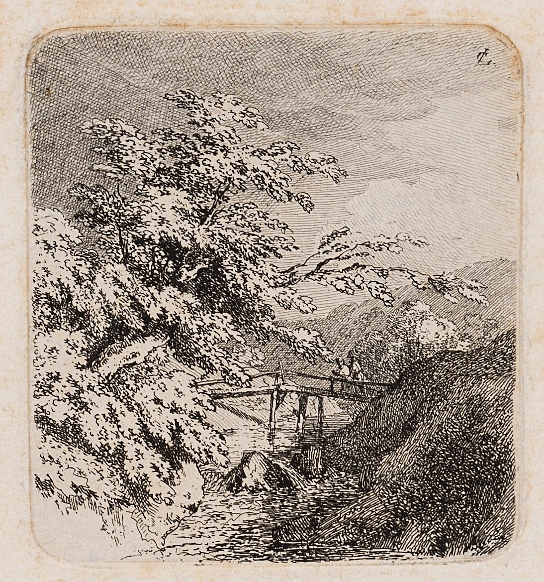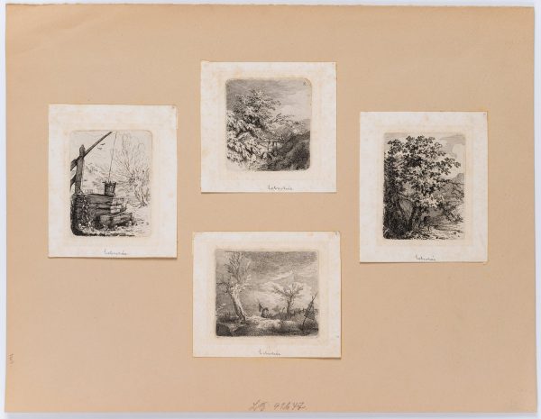 Carl August Lebschée (1800 Schmiegel – 1877 München), Vier Landschaften mit Figuren, Motive einer Wanderreise, vermutlich Oberbayern oder Franken, um 1850, Radierung