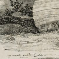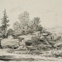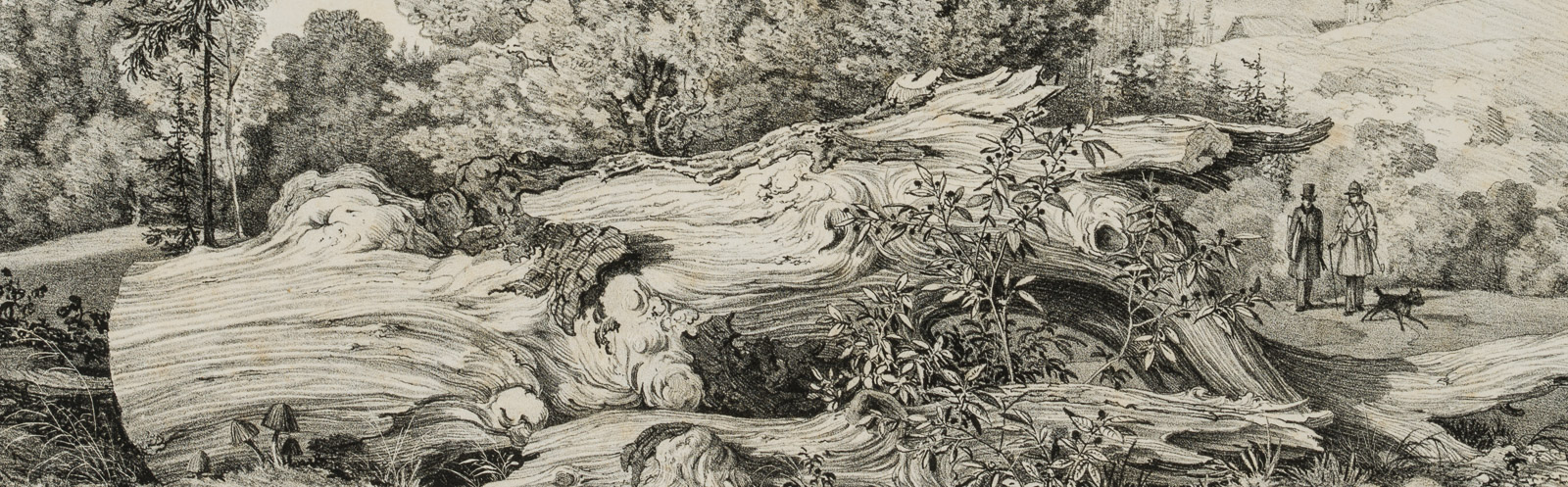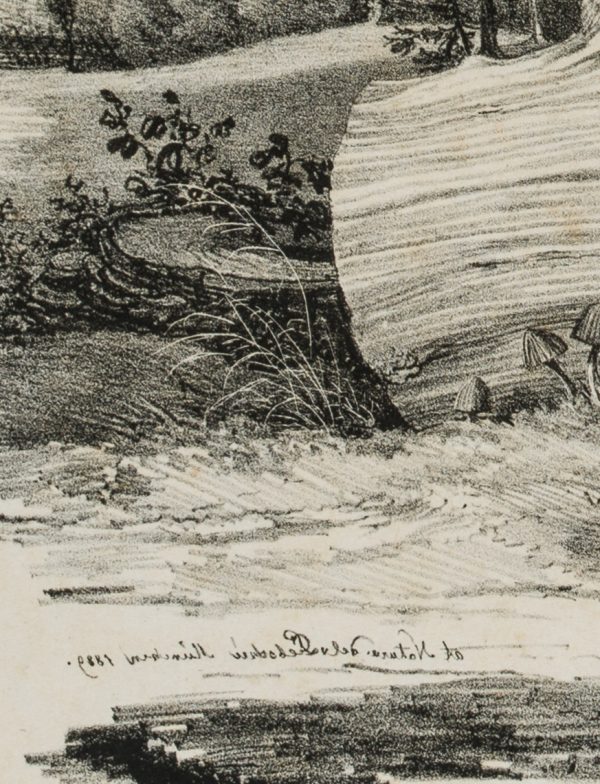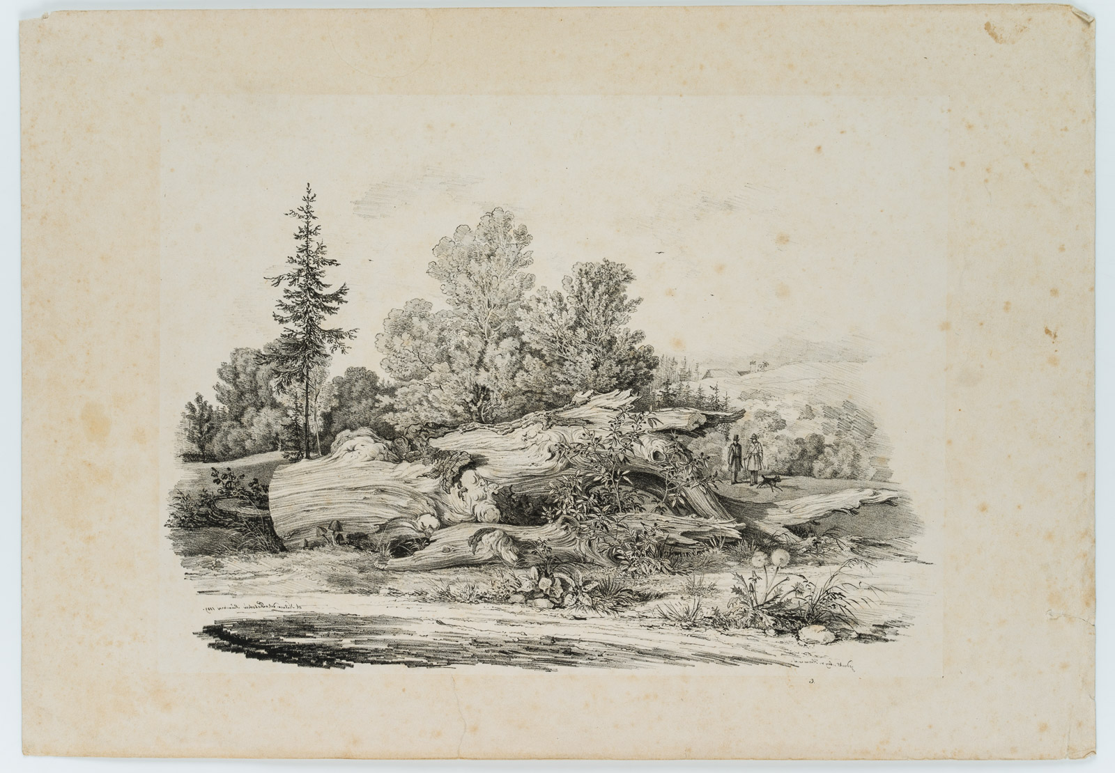 - Inscription: Inscribed in reverse at lower left “Lithographie von C. Lebschée bei Hermann, München, 1829”; numbered “3” at lower right. View of a gnarled tree in a meadow, on the right two walkers with a dog. The charm of the sheet arises from the tension between the perspective on the lovingly treated details in close proximity on the one hand and the painterly overall view of the landscape on the other. Inscribed on the verso with the artist’s life data and “Thieme-Becker XXII, 513. (Maillinger II, 1391”.)