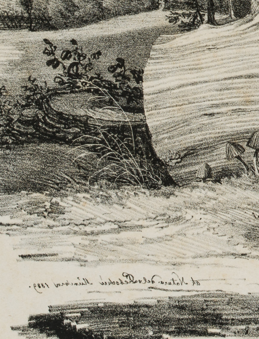 - Bezeichnung: Links unten in der Darstellung seitenverkehrt bezeichnet “Lithographie von C. Lebschée bei Hermann, München, 1829”; rechts unten nummeriert “3”. Blick auf ein knorriges Baumstück auf einer Wiese, rechts danaben zwei Spaziergänger mit Hund. Der Reiz des Blattes entsteht aus der Spannung zwischen dem Blickwinkel auf die liebevoll behandelten Details in unmittelbarer Nähe einerseits und der malerischen Gesamtauffassung der Landschaft andererseits. Verso bezeichnet mit den Lebensdaten des Künstlers und “Thieme-Becker XXII, 513. (Maillinger II, 1391”.)
