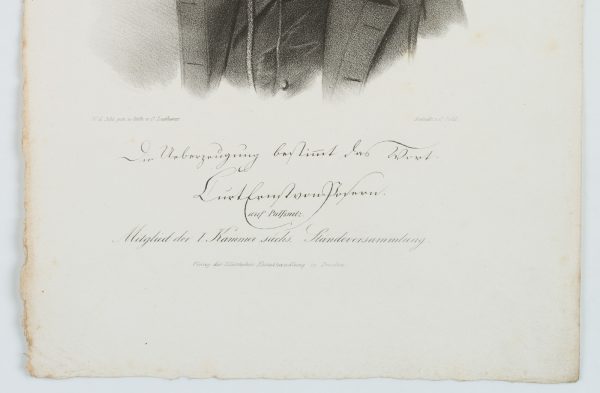 - Bezeichnung: Unten 2zeil. faksimil. Autograph „Die Ueberzeugung bestimmt das Wort. | Curt Ernst von Posern.“, darunter 2-zeil. Legende „auf Pulsnitz. | Mitglied der I. Kammer sächs. Ständevesammlung.“. Darunter Verlagsadresse. Carl Lutherer (1807 Schönberg im Vogtland – 1850 Dresden) war deutscher Zeichner und Lithograf. Besuch der Kunstschule der Dresdner Kunstakademie. 1825 Ehrenzeugnis der Kunstschule. Er wirkte in Dresden vornehmlich mit Porträtarbeiten bekannter Zeitgenossen.