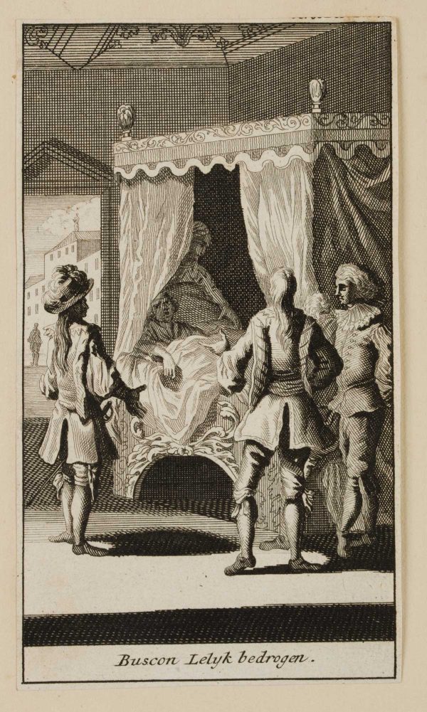 Caspar Luyken (1672 – 1708 ), Illustration zu Francisco de Quervedos Schelmenroman Historia de la vida del Buscón oder Historia del gran Tacaño, Buscon unschön betrogen, 1699, Etching