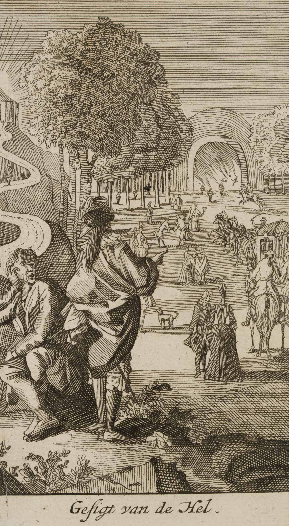 Caspar Luyken (1672 – 1708 ), Illustration zu Francisco de Quervedos Schelmenroman Historia de la vida del Buscón oder Historia del gran Tacaño, Der Hölle entronnen, 1699, Etching