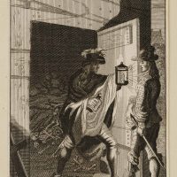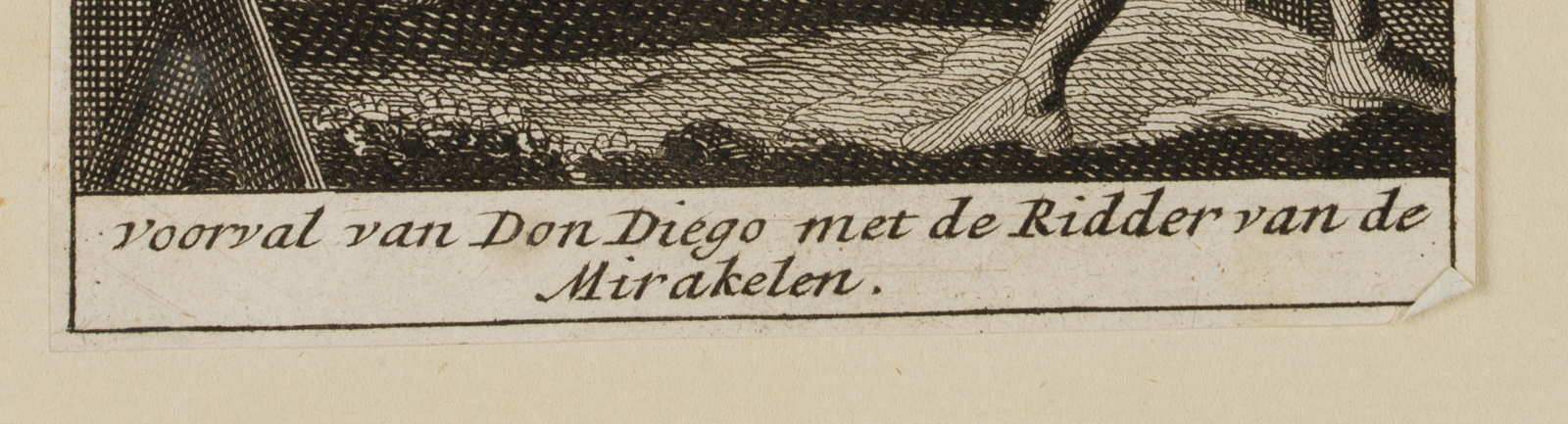 Caspar Luyken (1672 – 1708 ), Illustration zu Francisco de Quervedos Schelmenroman Historia de la vida del Buscón oder Historia del gran Tacaño, Don Diego am Grab mit dem wundersamen(?) Ritter, 1699, Radierung