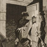 Caspar Luyken (1672 – 1708 ), Illustration zu Francisco de Quervedos Schelmenroman Historia de la vida del Buscón oder Historia del gran Tacaño, Don Diego am Grab mit dem wundersamen(?) Ritter, 1699, Etching