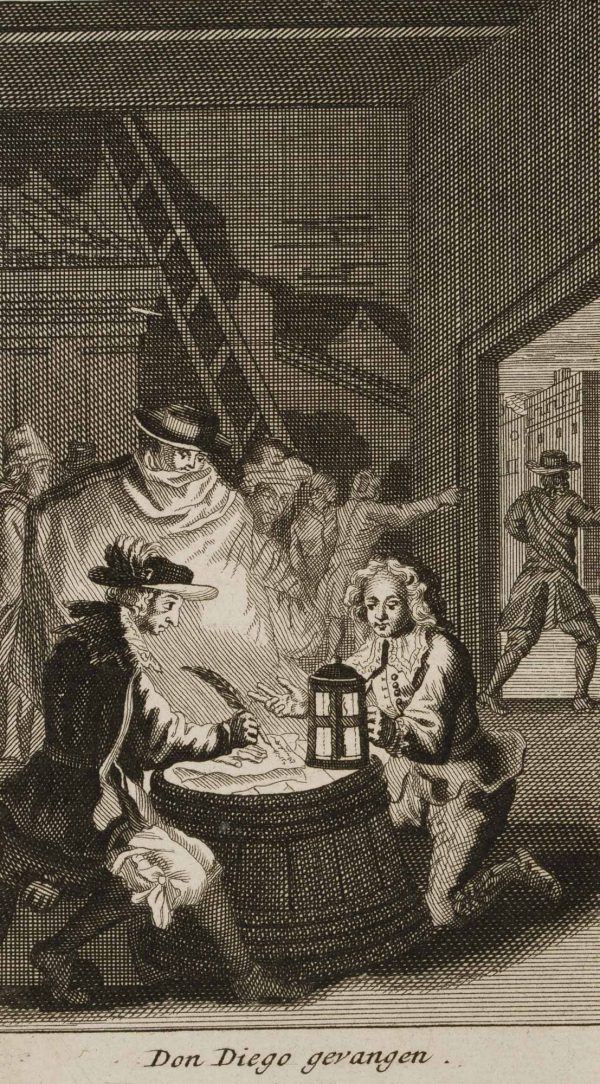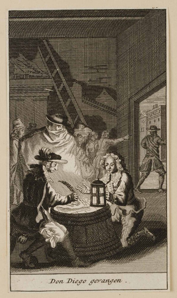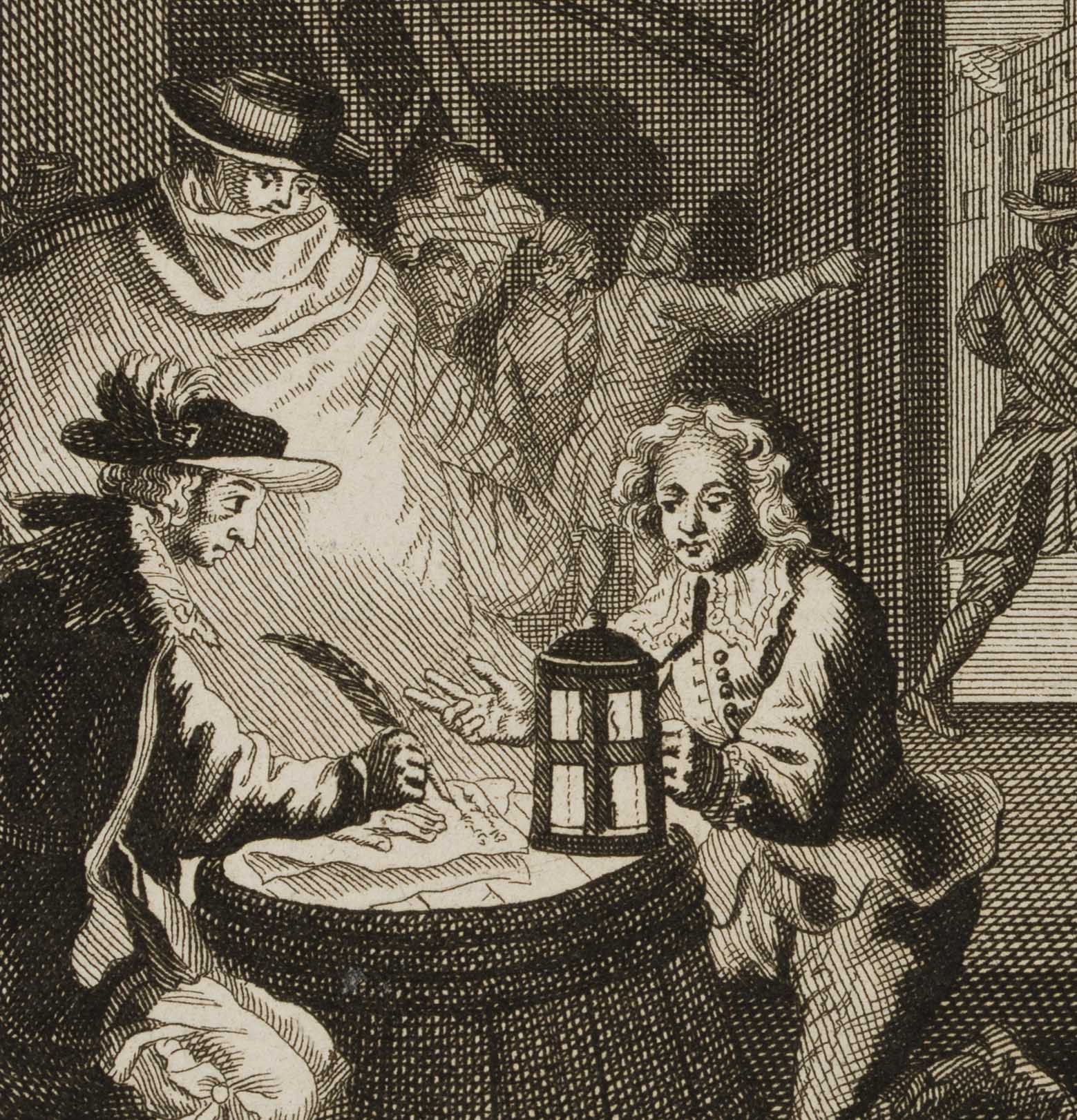 Caspar Luyken (1672 – 1708 ), Illustration for Francisco de Quervedo’s picaresque novel Historia de la vida del Buscón or Historia del gran Tacaño, Don Diego captured, kidnappers by candlelight, 1699, Etching