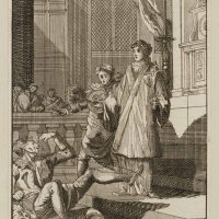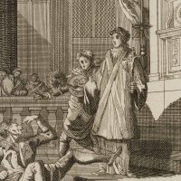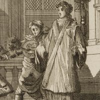 Caspar Luyken (1672 – 1708 ), Illustration to Francisco de Quervedo’s picaresque novel Historia de la vida del Buscón or Historia del gran Tacaño, Defeated bailiff in front of the altar of a church, 1699, Etching