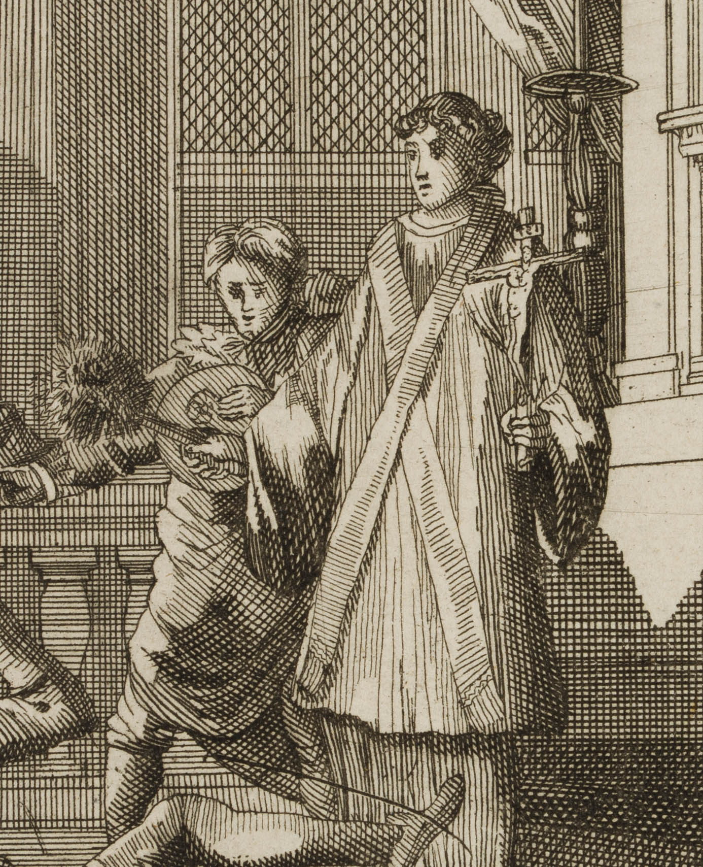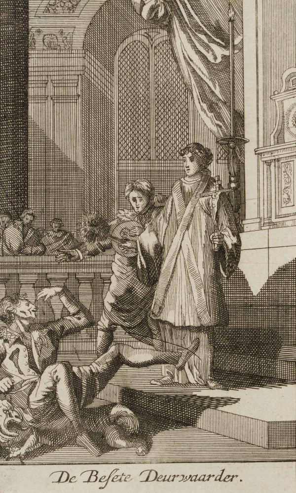 Caspar Luyken (1672 – 1708 ), Illustration zu Francisco de Quervedos Schelmenroman Historia de la vida del Buscón oder Historia del gran Tacaño, Besiegter Gerichtsvollzieher vor dem Altar einer Kirche, 1699, Radierung