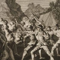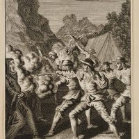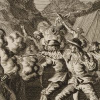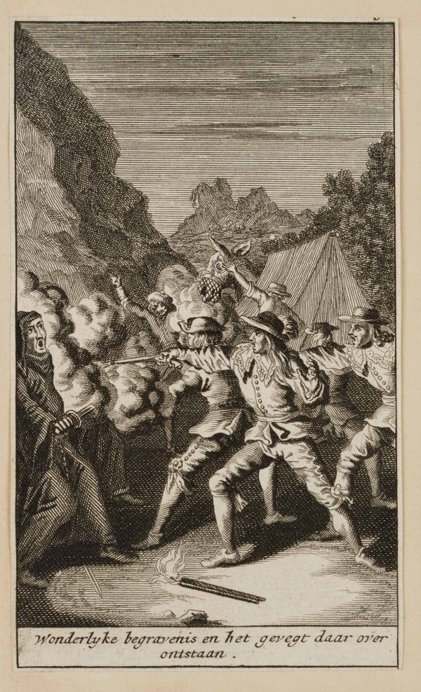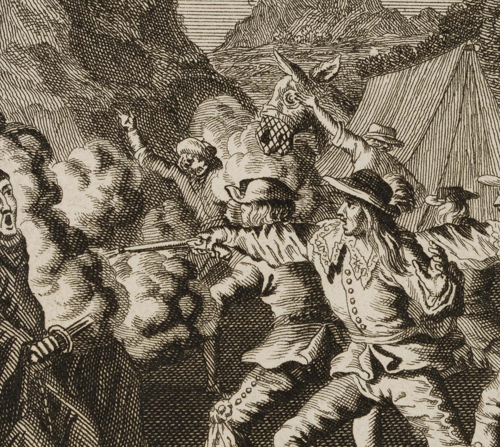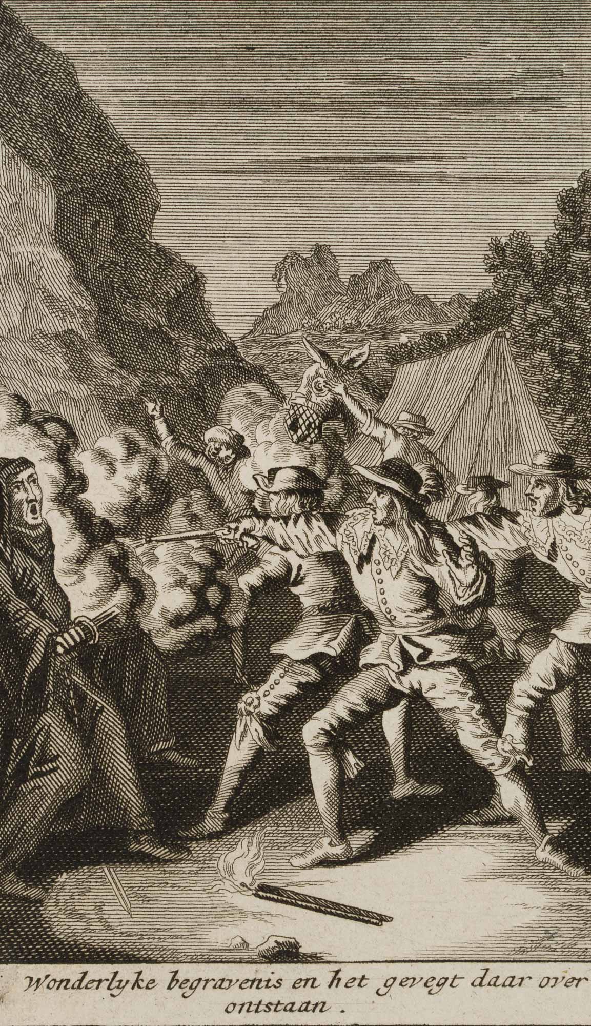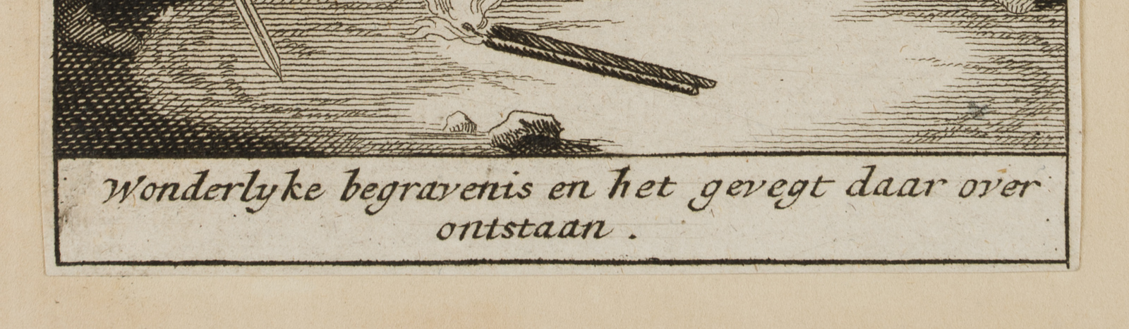 Caspar Luyken (1672 – 1708 ), Illustration zu Francisco de Quervedos Schelmenroman Historia de la vida del Buscón oder Historia del gran Tacaño, Wunderliches Begräbnis, 1699, Radierung