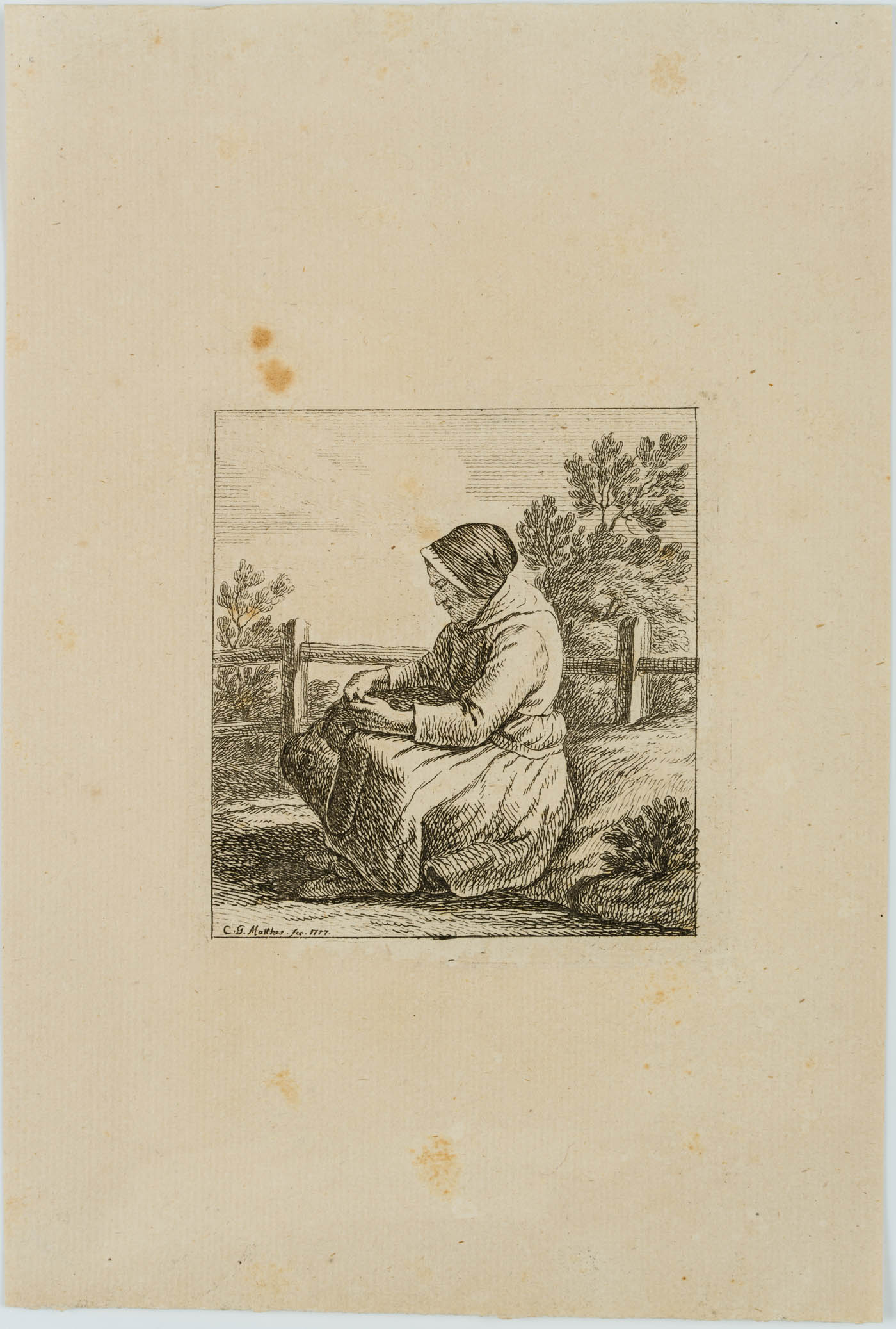 Christian Gottfried Mathes (1738 Berlin – um 1805 ebd.), Bäuerin, am Wegesrand sitzend, 1777, Radierung