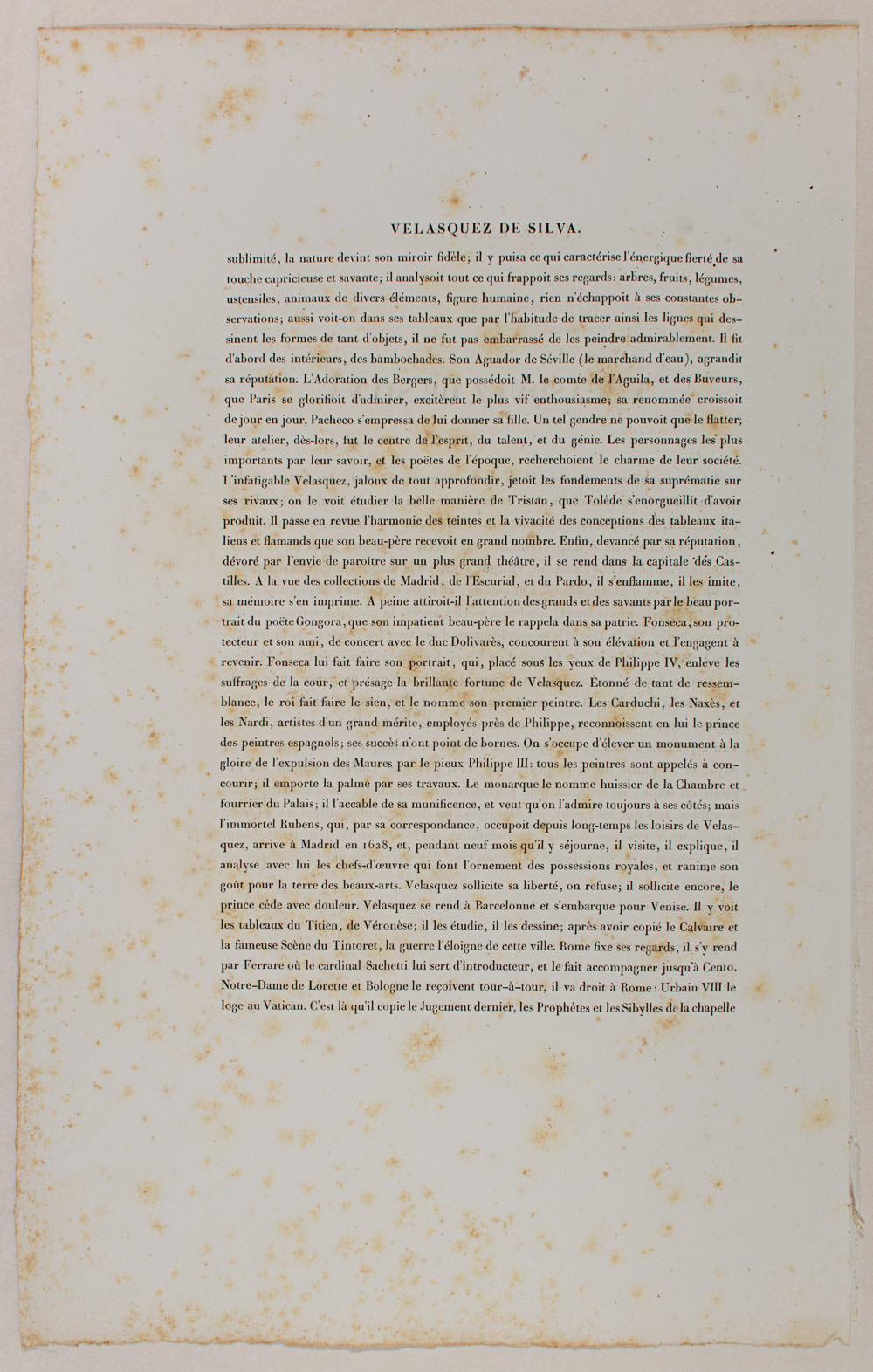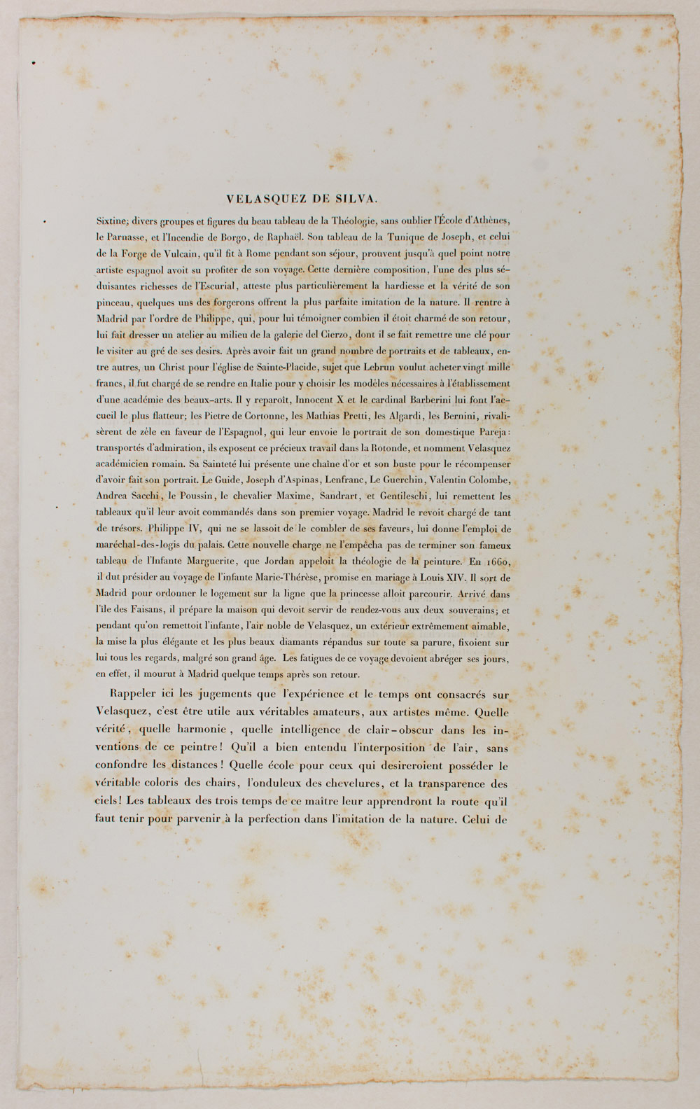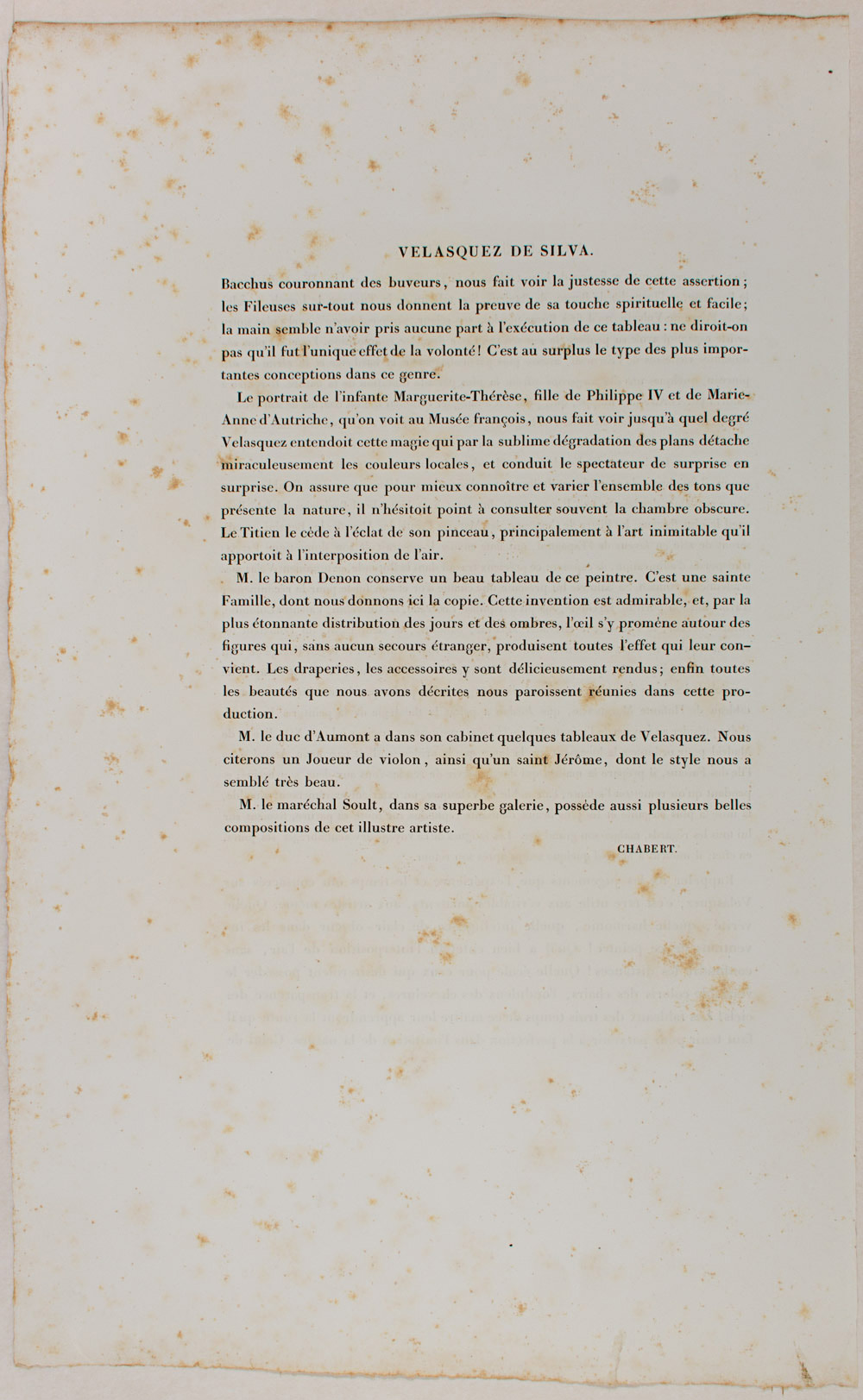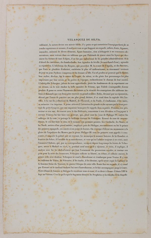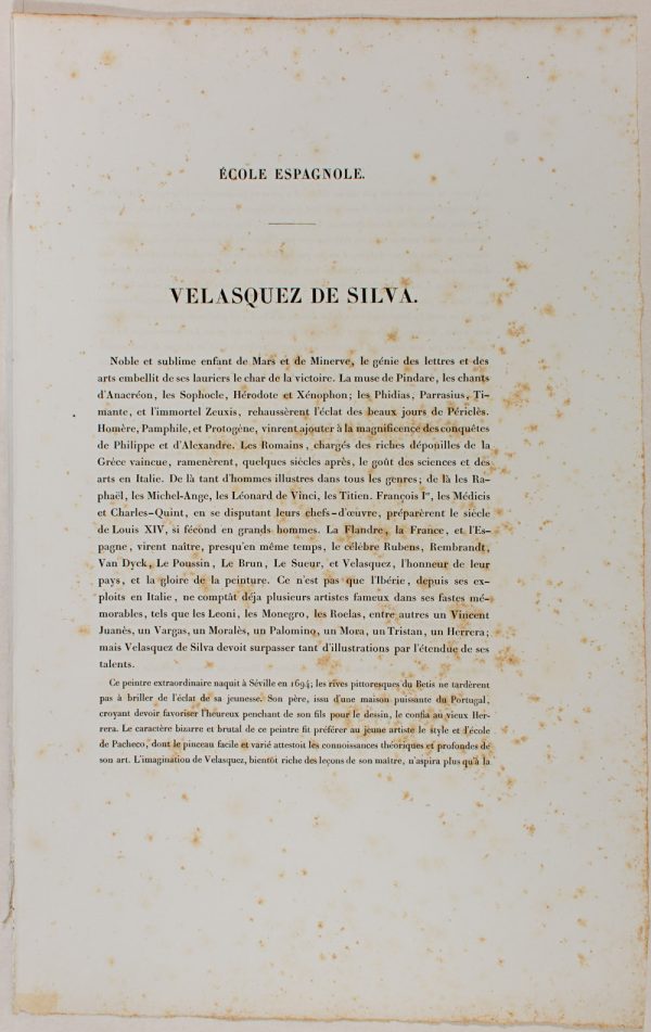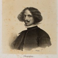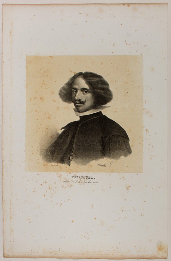 - Description: Portrait of the painter Velasquez de Silva (1599 -1680}. He was a painter of the Florentine School. Colour lithograph by Villain. From the series: Pictures of the Italian School (ECOLES D’ITALIE). Signed: Mauraisse f. Inscribed: Lith. de Villain. Title: VALASQUEZ d’apres son portrait par lui-meme. Separate text sheet (In French, by Chabert) in the format of the art sheet.