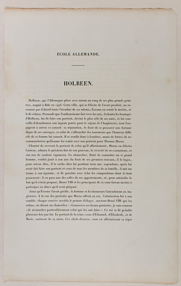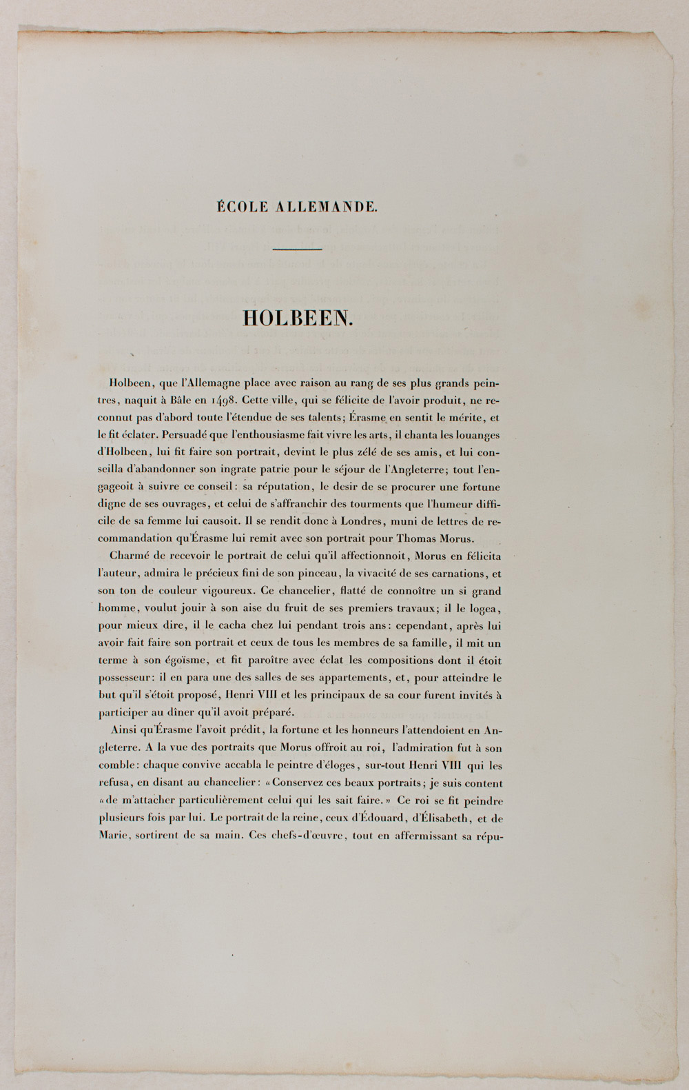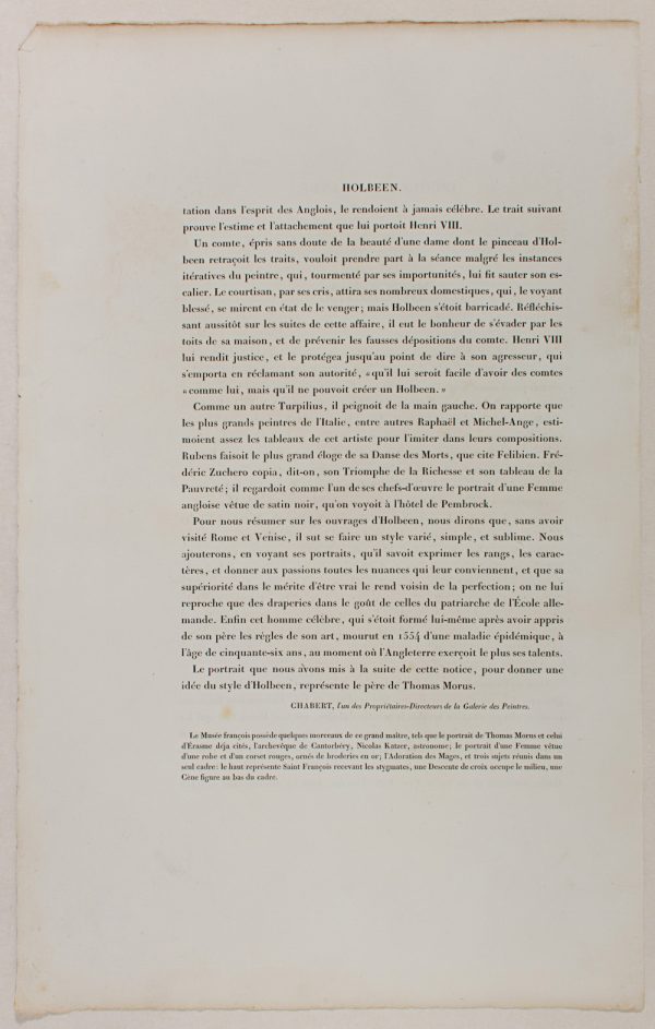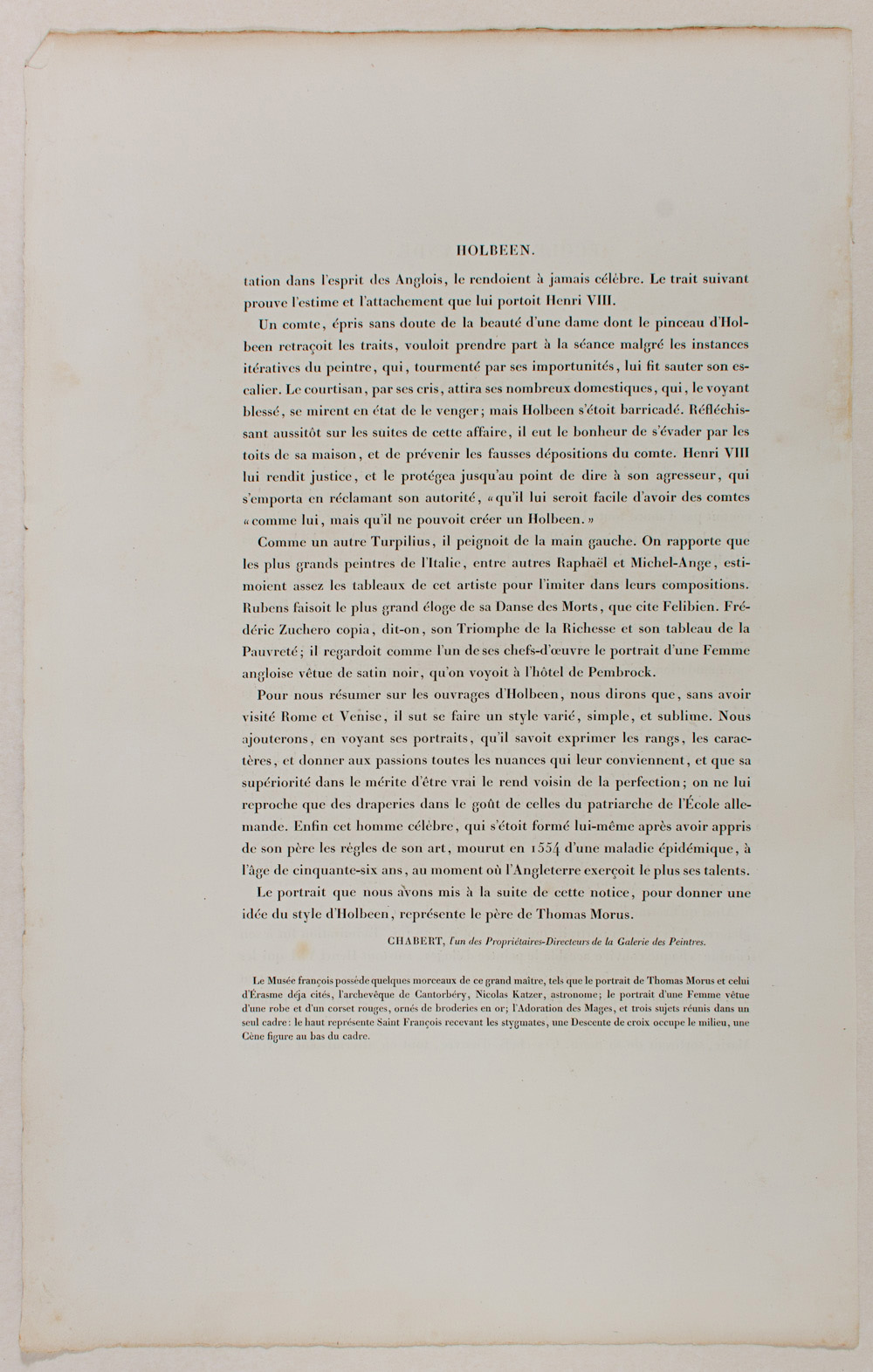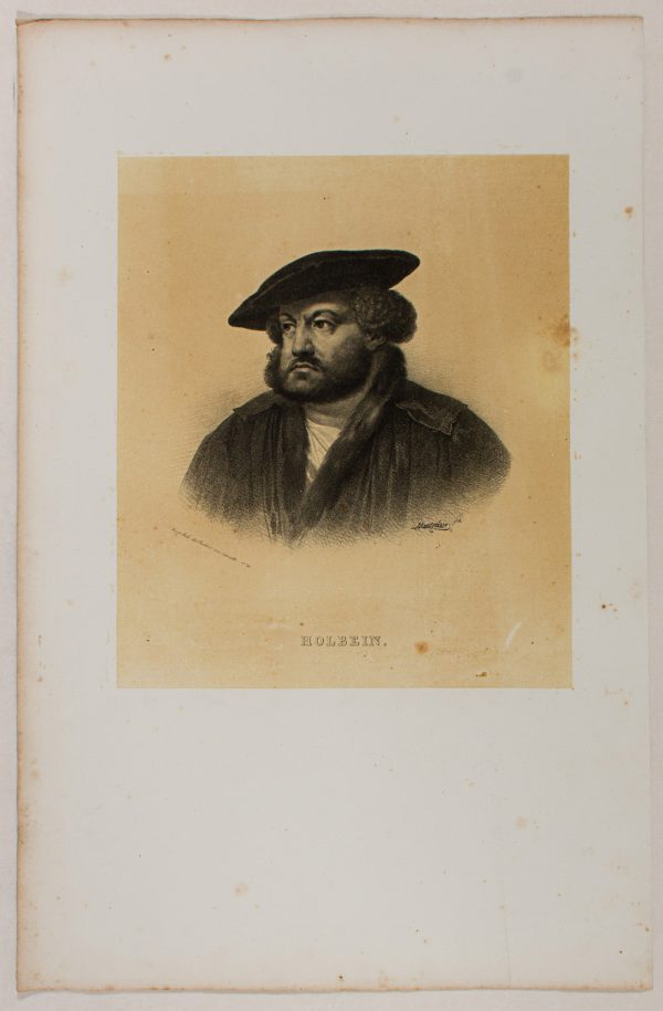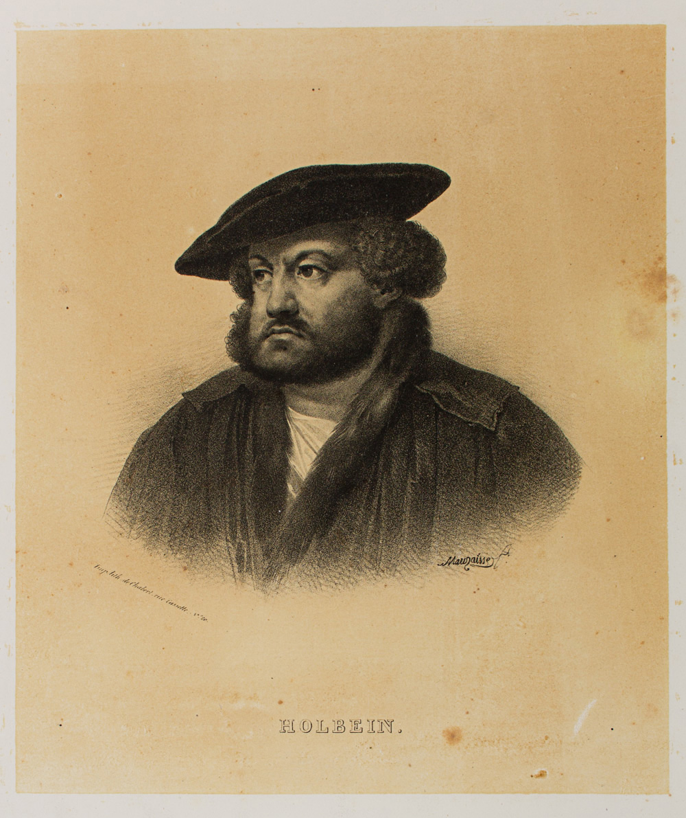 - Description: Portrait of the painter Hans Holbein (1498 -1554). He was a painter of the German (the table of contents says Dutch) school. Colour lithograph by Chabert. From the series: Pictures of the Flemish, Dutch and German School (ECOLE FLAMANDE, HOLLANDAISE ET ALLEMANDE). Signed: Mauraisse. Inscribed: lmp. lith. de Chabert, rue Cassette, N. 20. HOLBEIN. Separate text sheet (In French, by Chabert) in the format of the art sheet.