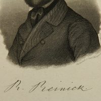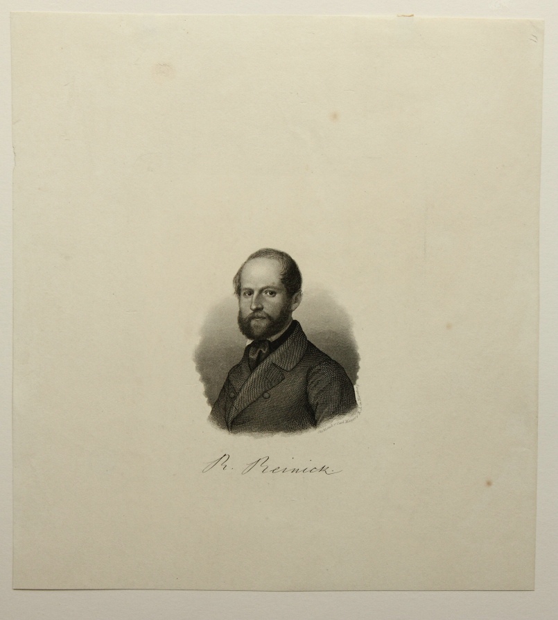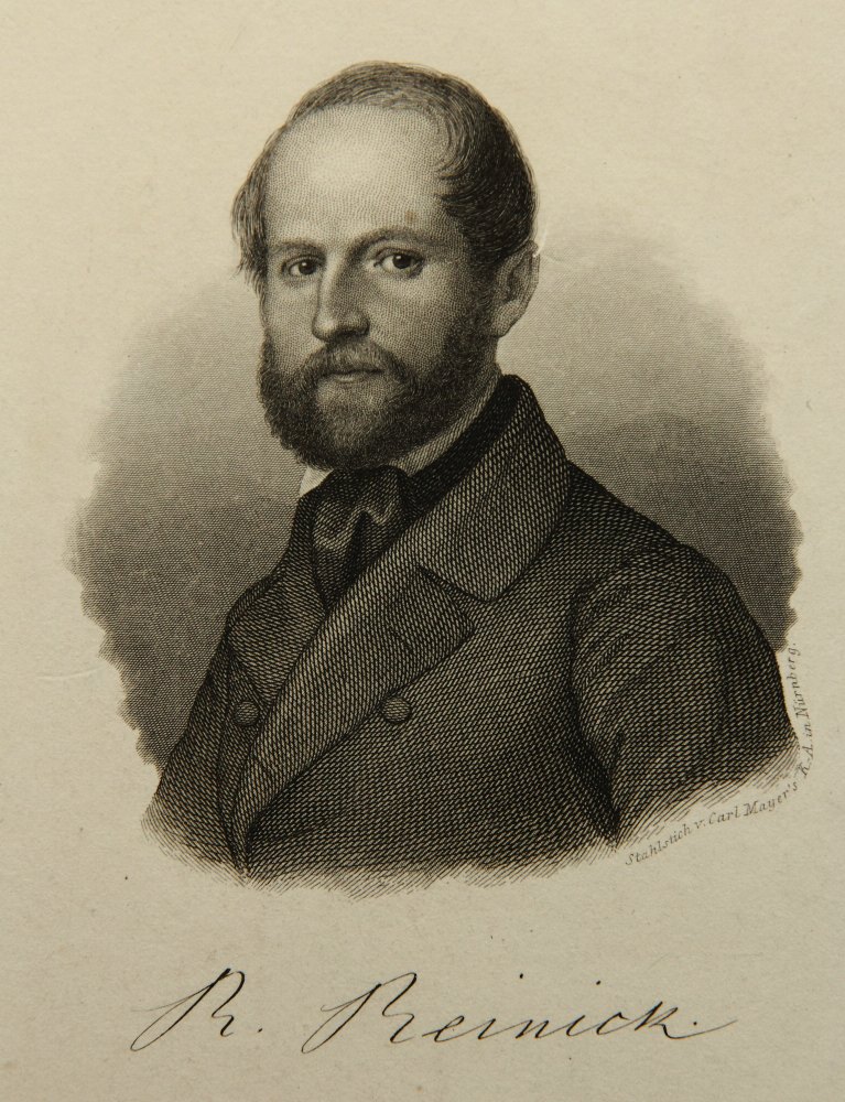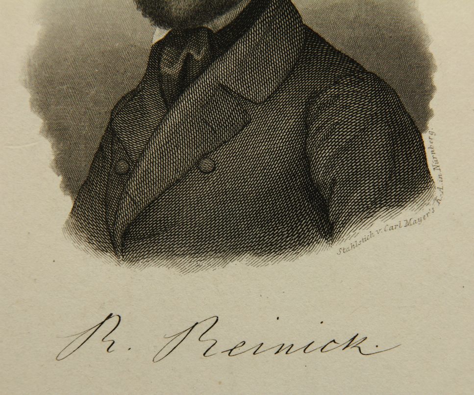 - Beschreibung: Carl MAYER (1798 Nürnberg – 1868 ebd. ), Büstenporträt des Robert Reinick (1805 Danzig – 1852 Dresden), Maler und Dichter, Stahlstich. Beschreibung: Stahlstich auf Papier. Unterhalb der Darstellung in Druckplatte signiert und mit Namen des Dargestellten bezeichnet. Rückseitig befindet sich ein Sammlungsstempel mit dem Monogramm “EK”.