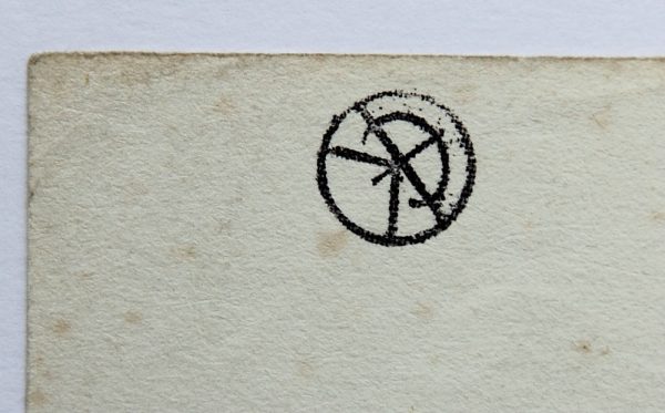 - Condition: Good condition. Light soiling and foxing visible on the edge of the sheet. Multiple crease marks are visible in the lower left corner of the sheet. There are three small holes on the left edge of the sheet – the sheet was probably removed from a book binding.