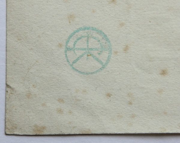 - Zustand: Guter Zustand. Leichte Verschmutzungen und Stockflecken auf dem Blattrand sichtbar. In der unteren linken Blattecke sind mehrfache Knickspuren erkennbar. Am linken Blattrand befinden sich drei kleine Löcher – das Blatt wurde vermutlich aus einer Buchbindung herausgelöst.