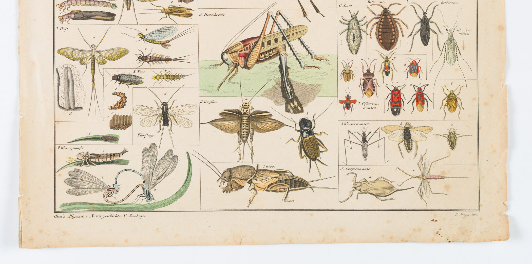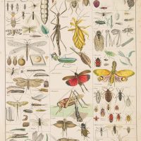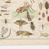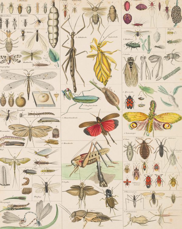 - Description: Encyclopaedic board with numerous illustrations of various insects, including: Ant lions, water dragonflies, stick insects, mantis shrimp, aphids, cicadas, lantern bearers, water bugs, etc.