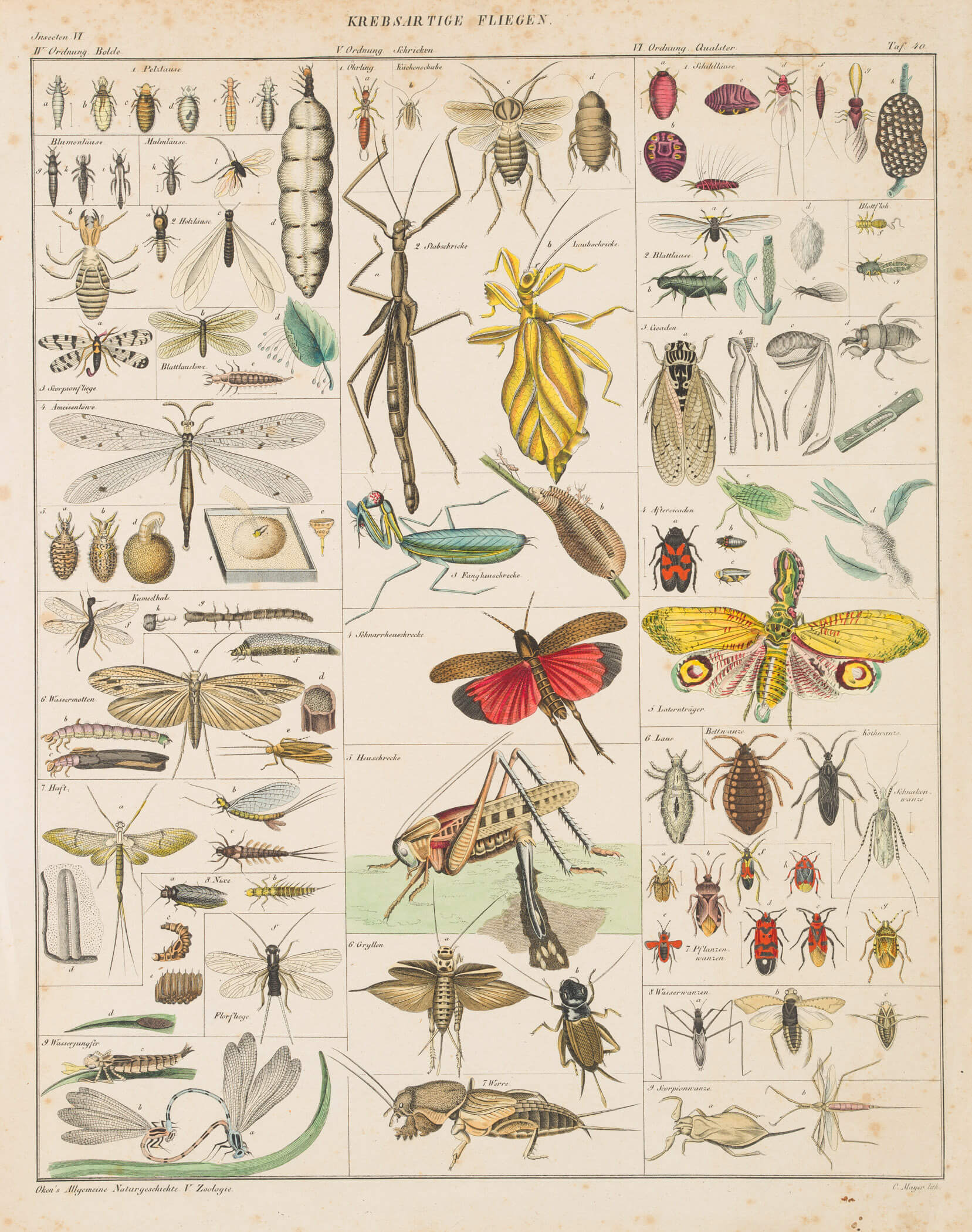 - Bezeichnung: Unten mittig im Druck signiert: “”. Oben mittig im Druck bezeichnet: “Krebsartige Fliegen”. Oben rechts nummeriert: “Taf. 40”.