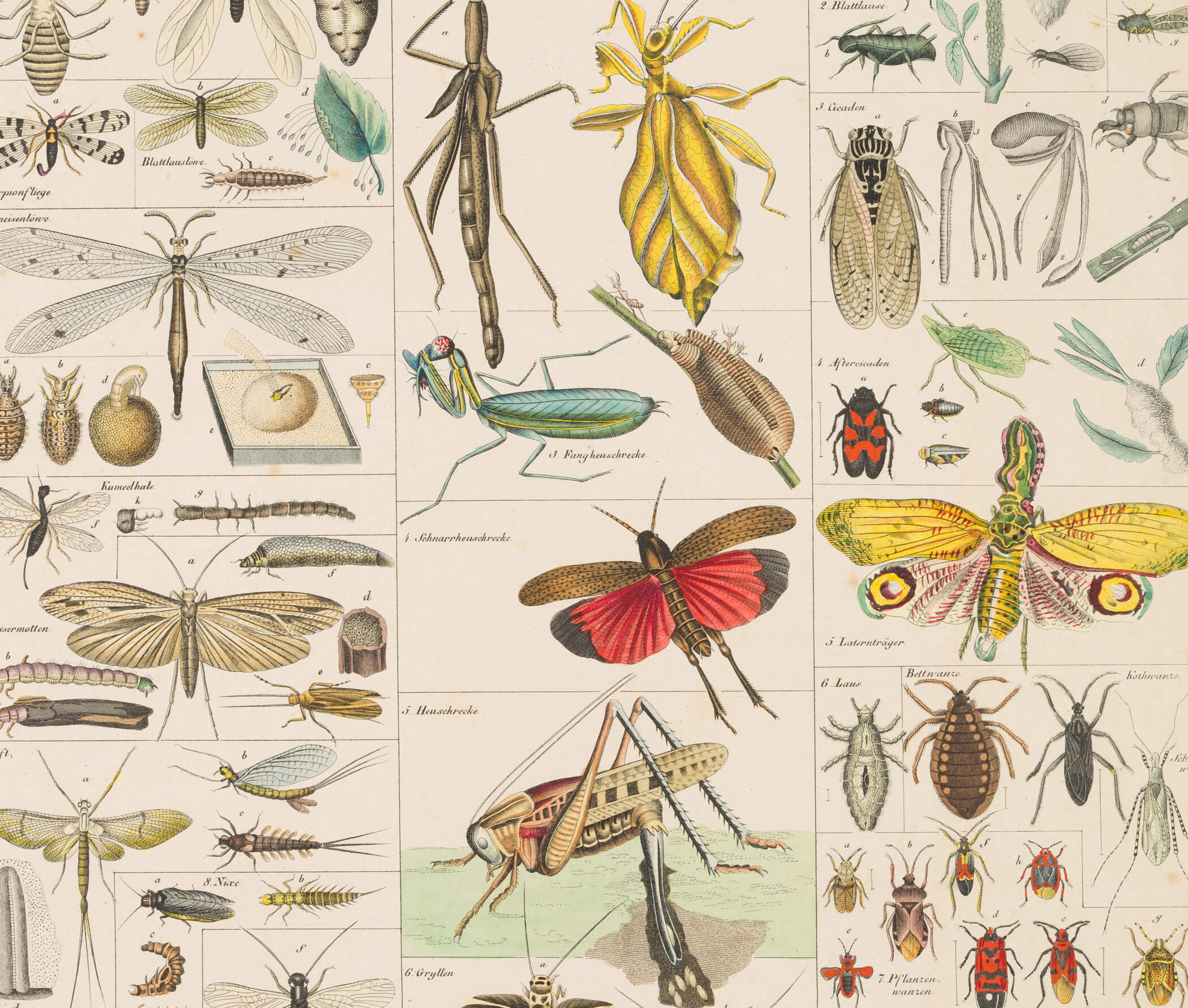 - Beschreibung: Enzyklopädische Tafel mit zahlreichen Illustrationen unterschiedlicher Insekten, darunter: Ameisenlöwen, Wasserjungfer, Stabschricke, Fangheuschrecke, Blattläuse, Cicaden, Laternträger, Wasserwanzen usw.