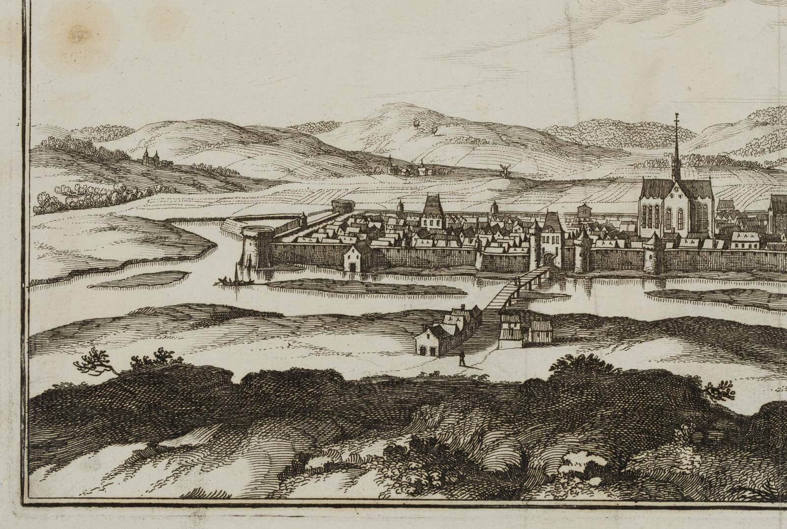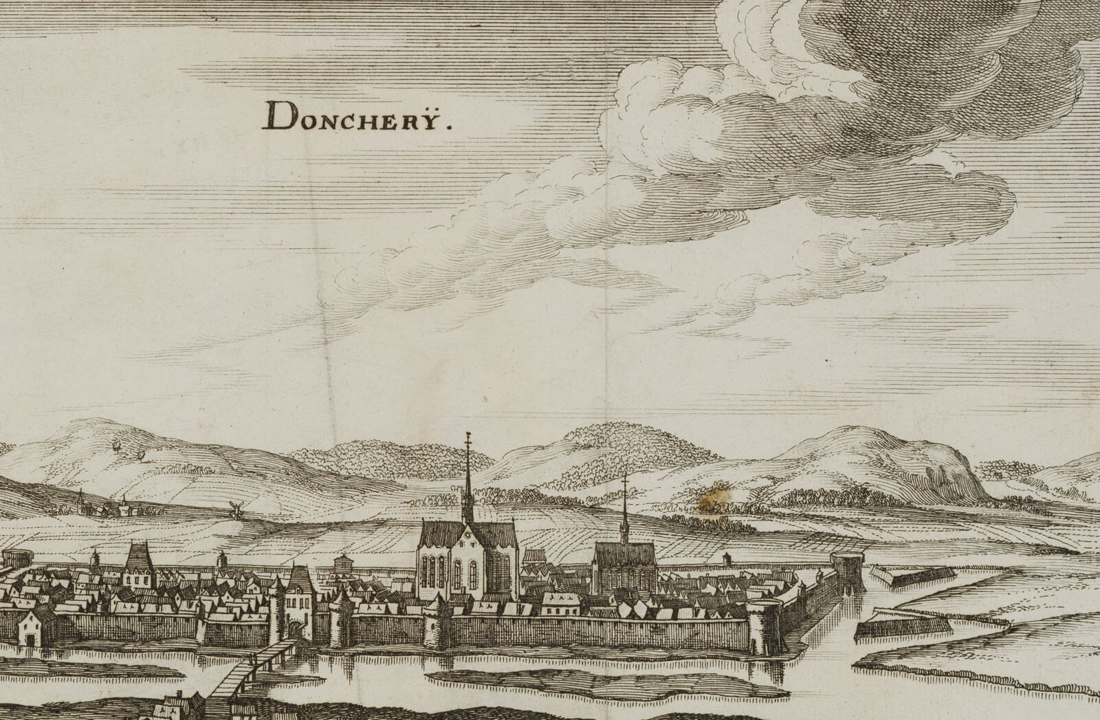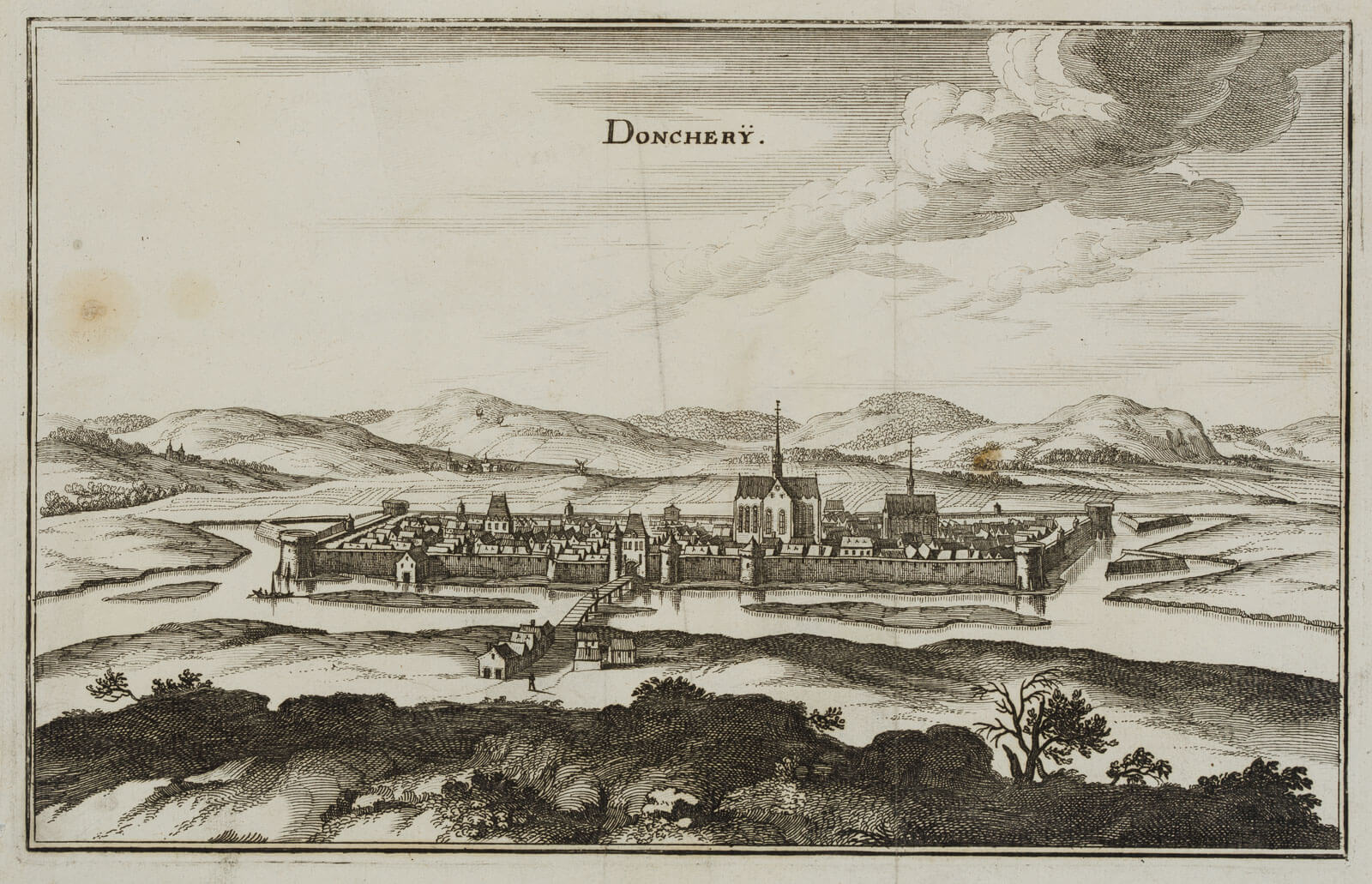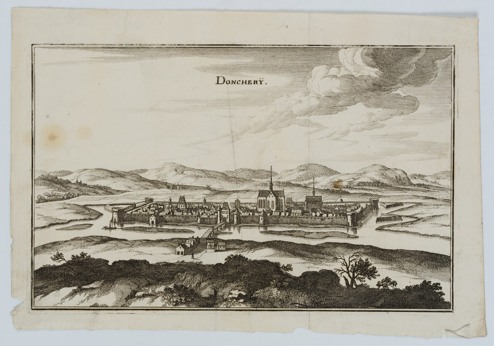 - Description: Caspar Merian(1627 Frankfurt am Main – 1686 Waltha Castle, West Frisia), Veduta of Donchery, city view, 1661, etching