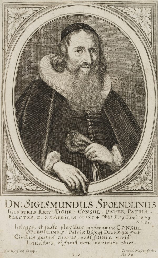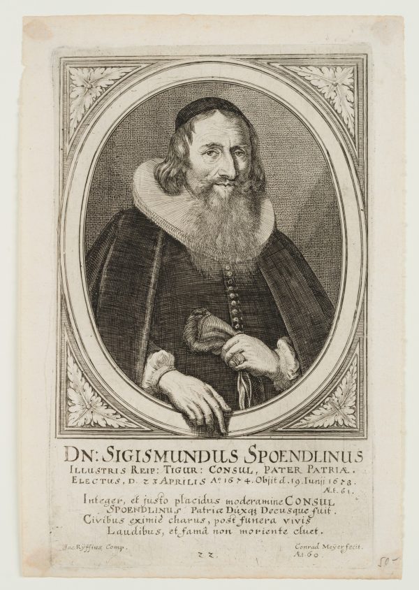 - Inscription: Lower middle signed: “Jac Ryffius Comp. | Conrad Meyer fecit AEt 60”. Lower middle inscribed in the printing plate: “DN: Sigismundus Spoendlinus”.