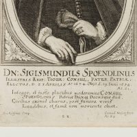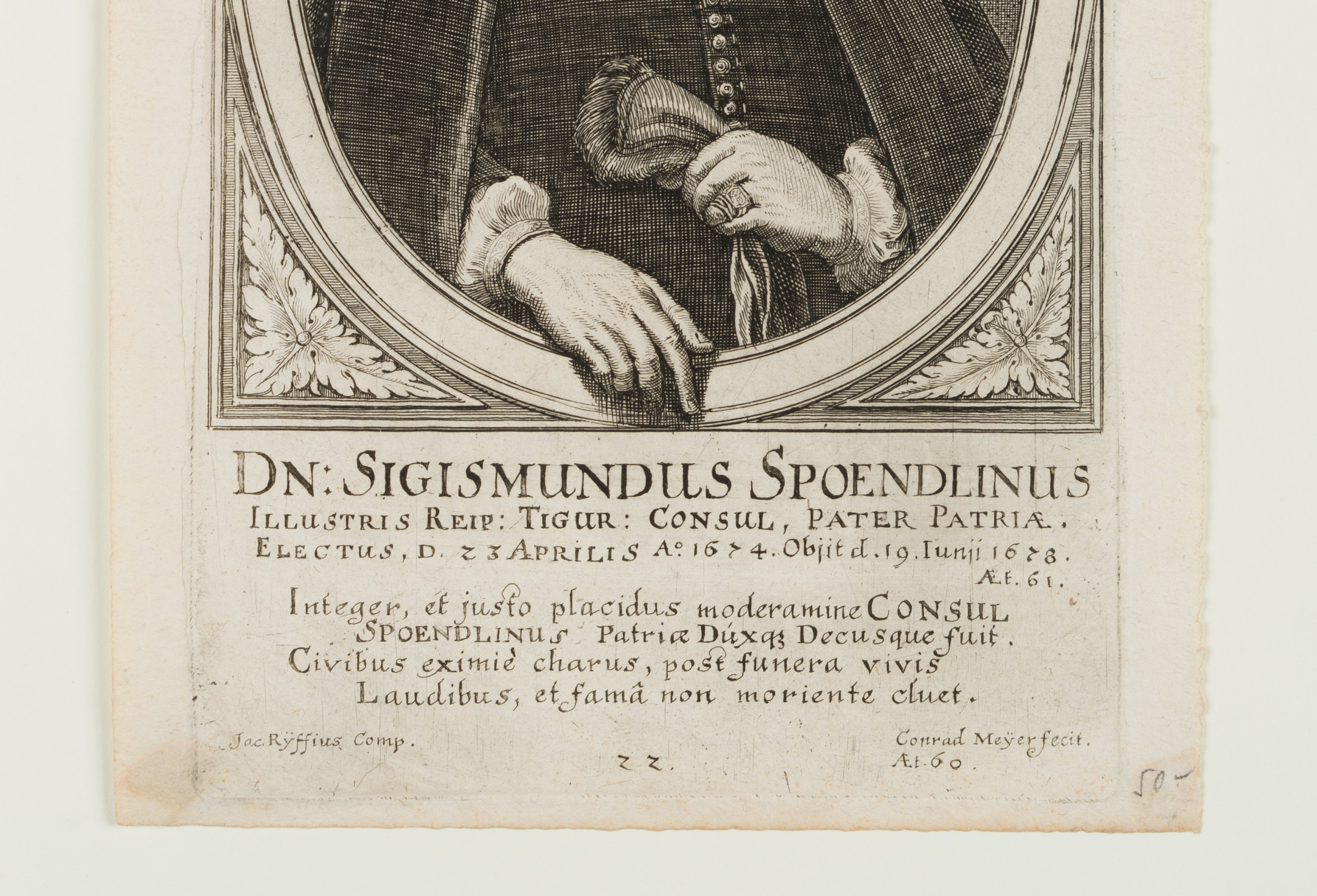 - Bezeichnung: Unten mittig signiert: “Jac Ryffius Comp. | Conrad Meyer fecit AEt 60”. Unten mittig im Druck bezeichnet: “DN: Sigismundus Spoendlinus”.