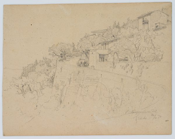 - Description: Serpentine road on the steep slopes of Fiesole with houses on the hillside. A cart with mules drives along the road.
