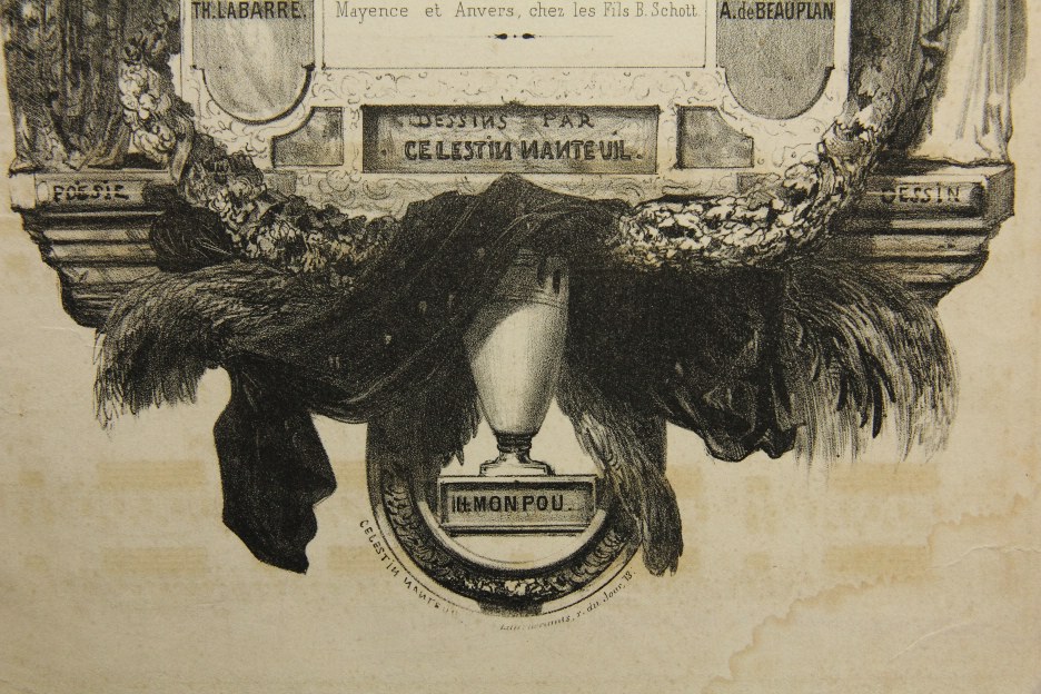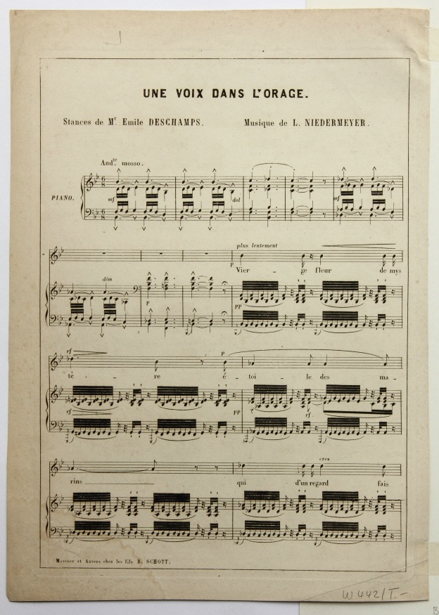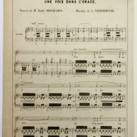 - Description: On the back is the imprint of the notes to Une voix dans l’orage by mile Deschamps (1791 Bourges – 1871 Versailles) and Louis Niedermeyer (1802 Nyon – 1861 Paris).