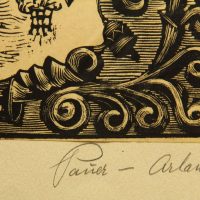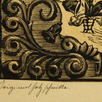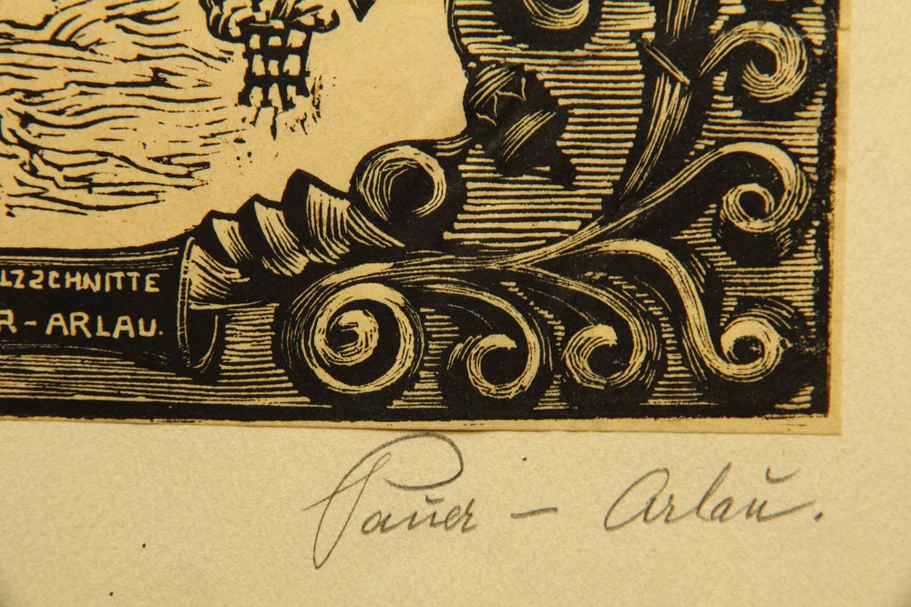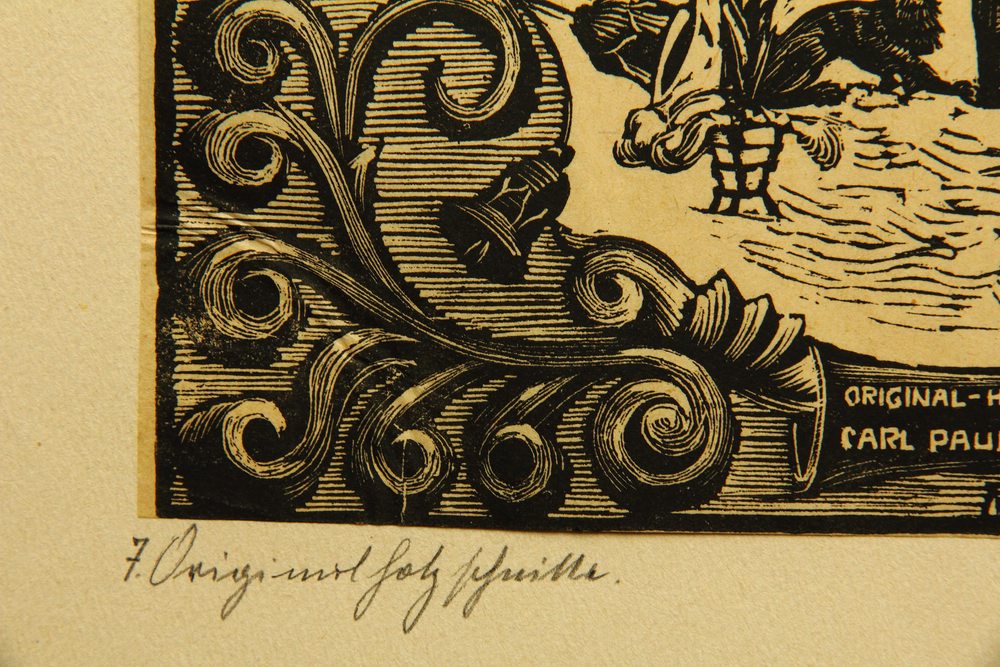 - Beschreibung: Am unteren Rand der Darstellung im Druckstock signiert. Darunter zusätzlich mit Bleistift signiert und mit “7.Originalholzschnitt” bezeichnet.