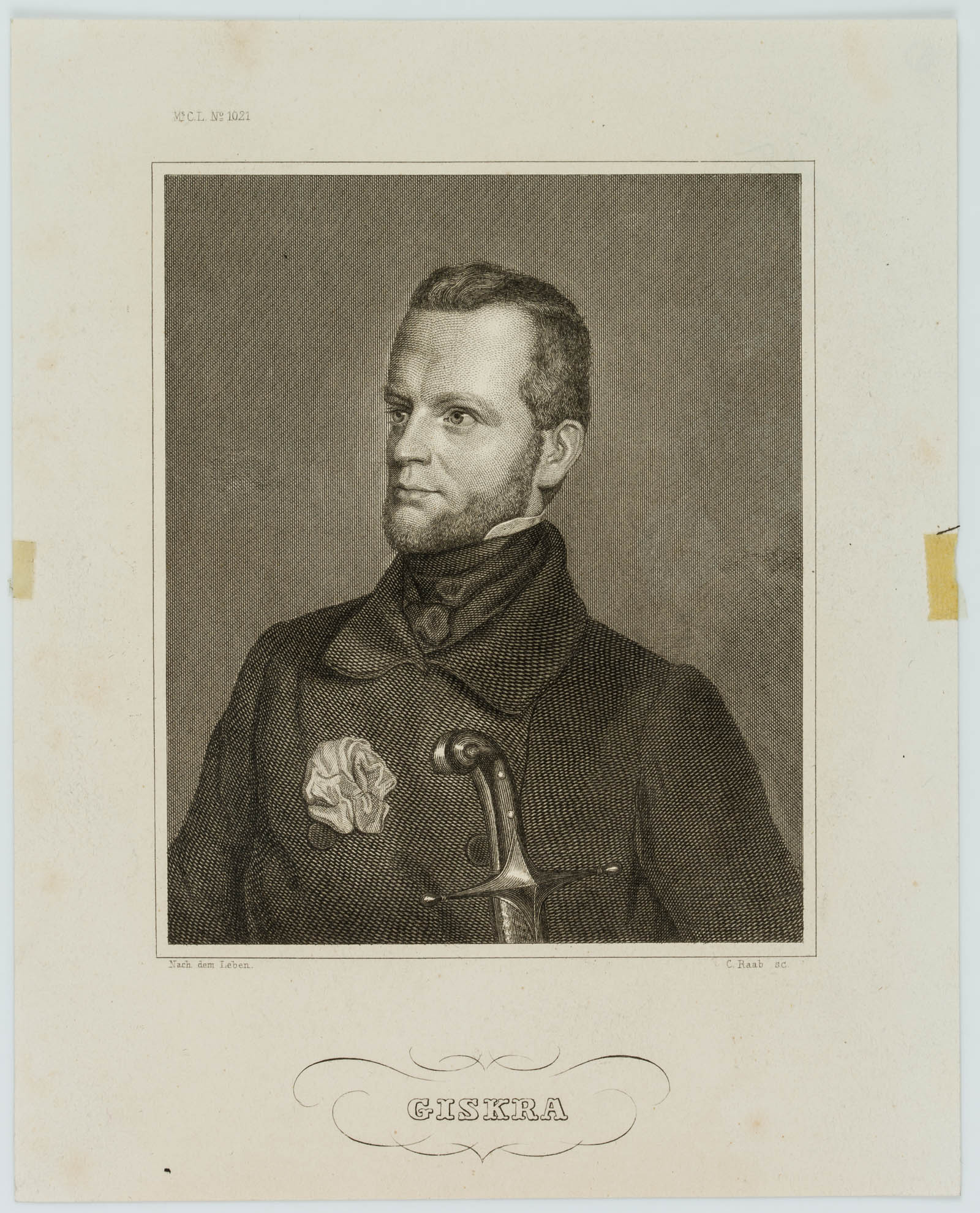 - Inscription: Titled and inscribed below the image: “Nach dem Leben. / C. Raab sc.”. Inscribed on the left above the depiction: “M.s No. 1021. Verso numbered: “1480” and inscribed with the sitter’s life data; illegibly inscribed with collection name.
