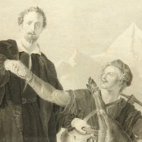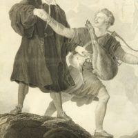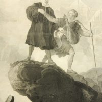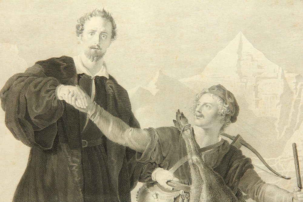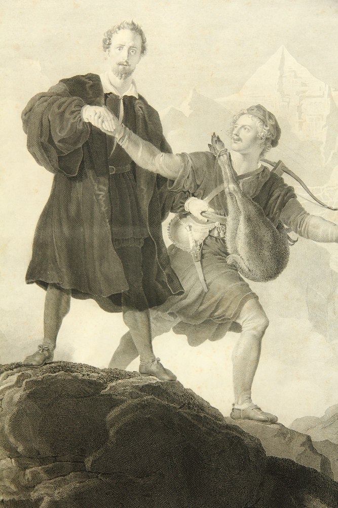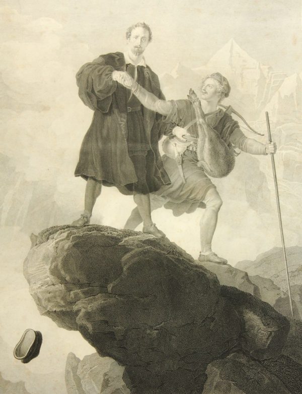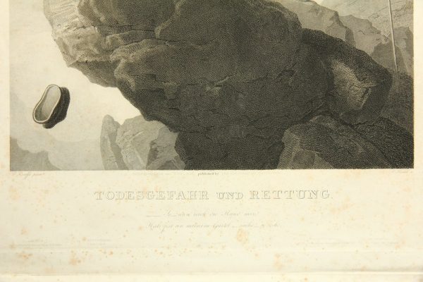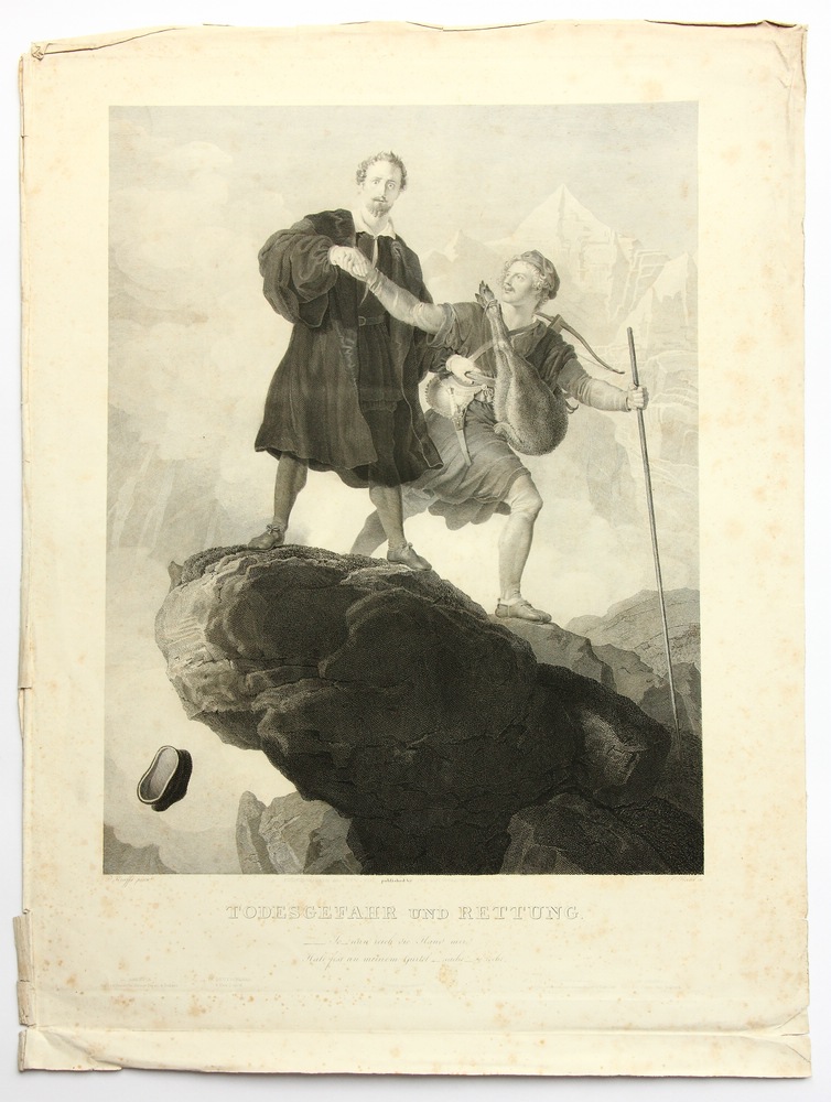 - Description: After an original by Johann Peter Krafft (1780 Hanau – c. 1856 Vienna). Full-length depiction of a wandering scholar with horrified facial expression before a precipice on a rock in the mountains. Behind him a mountain hunter with crossbow and killed game supports the frightened wanderer whose cap sails into the depth.