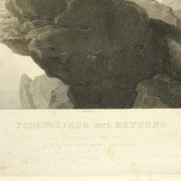 - Beschreibung: Nach einer Vorlage von Johann Peter Krafft (1780 Hanau – um 1856 Wien). Ganzfigurige Darstellung eines wandernden Scholaren mit entsetztem Gesichtsausdruck vor einem Abgrund auf einem Felsen im Gebirge. Hinter ihm steht ein Gebirgsjäger mit Armbrust und erlegtem Wild und stützt den erschrockenen Wanderer, dessen Mütze in die Tiefe segelt.
