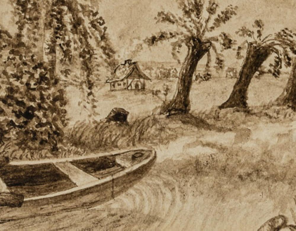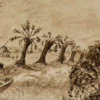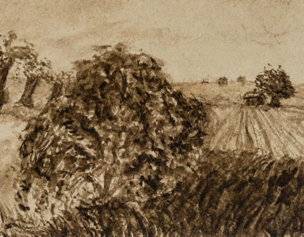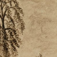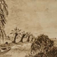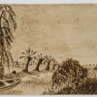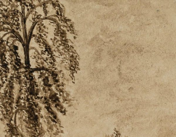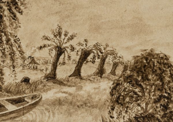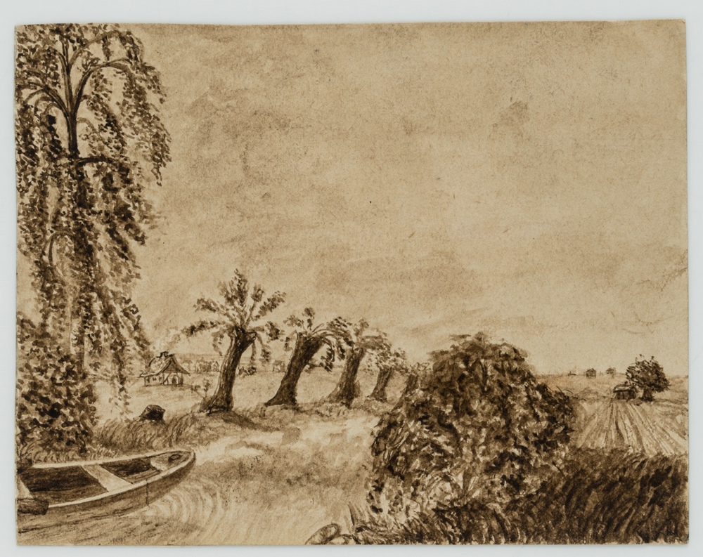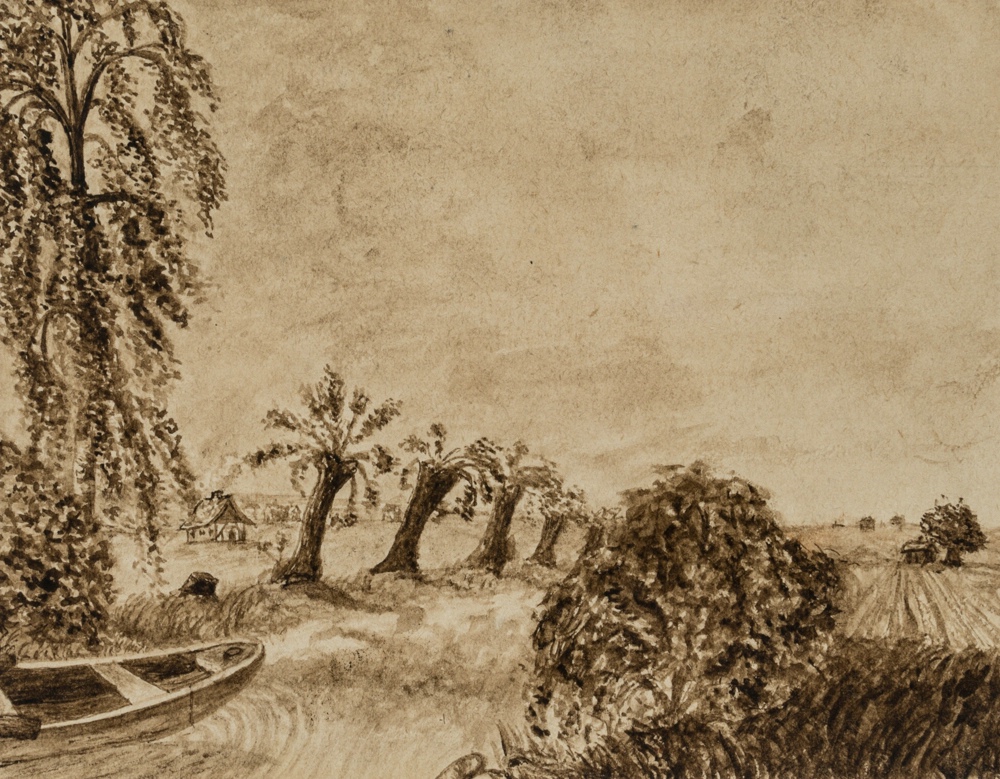 C.A. Reichardt (19. Jahrhundert), Kopfweiden in norddeutscher Landschaft, um 1880, Pinselzeichnung