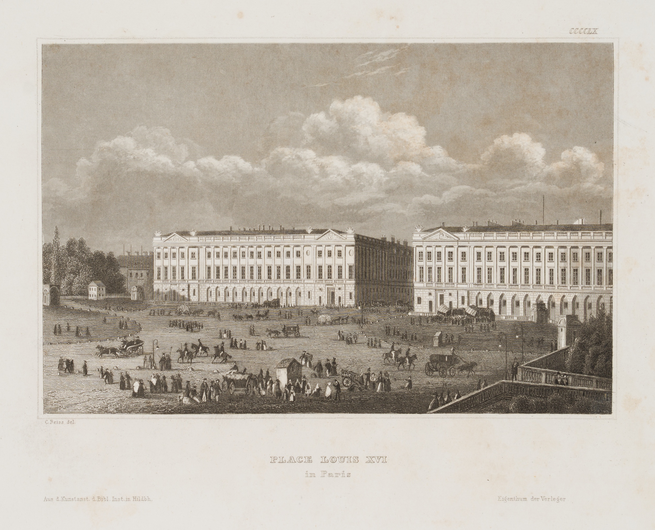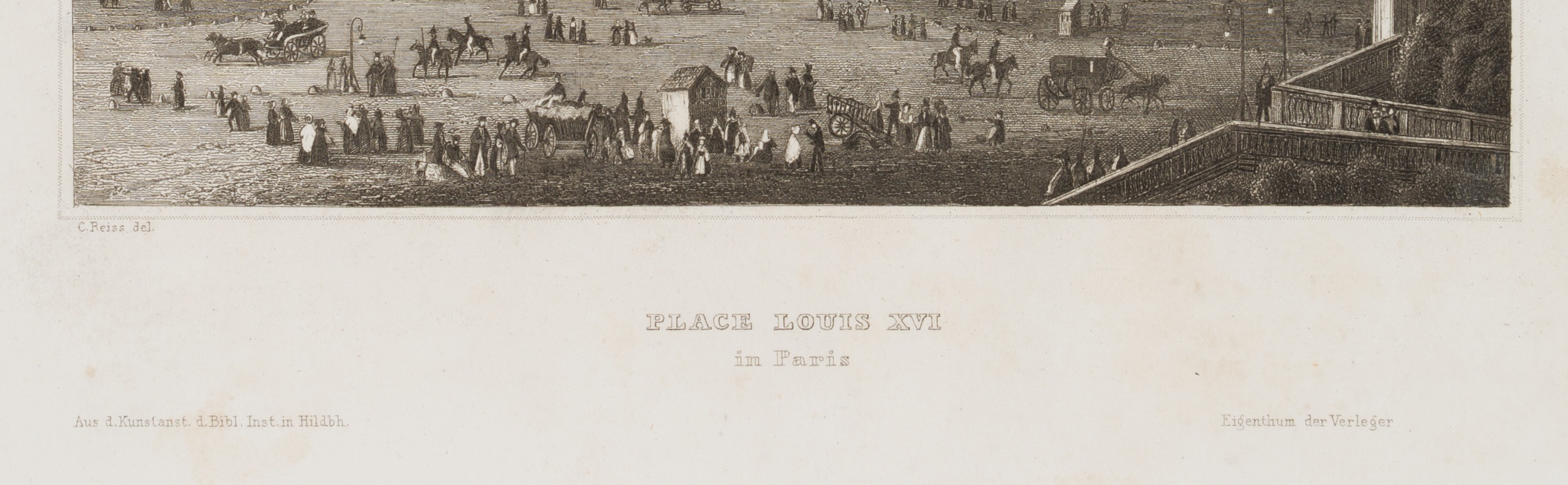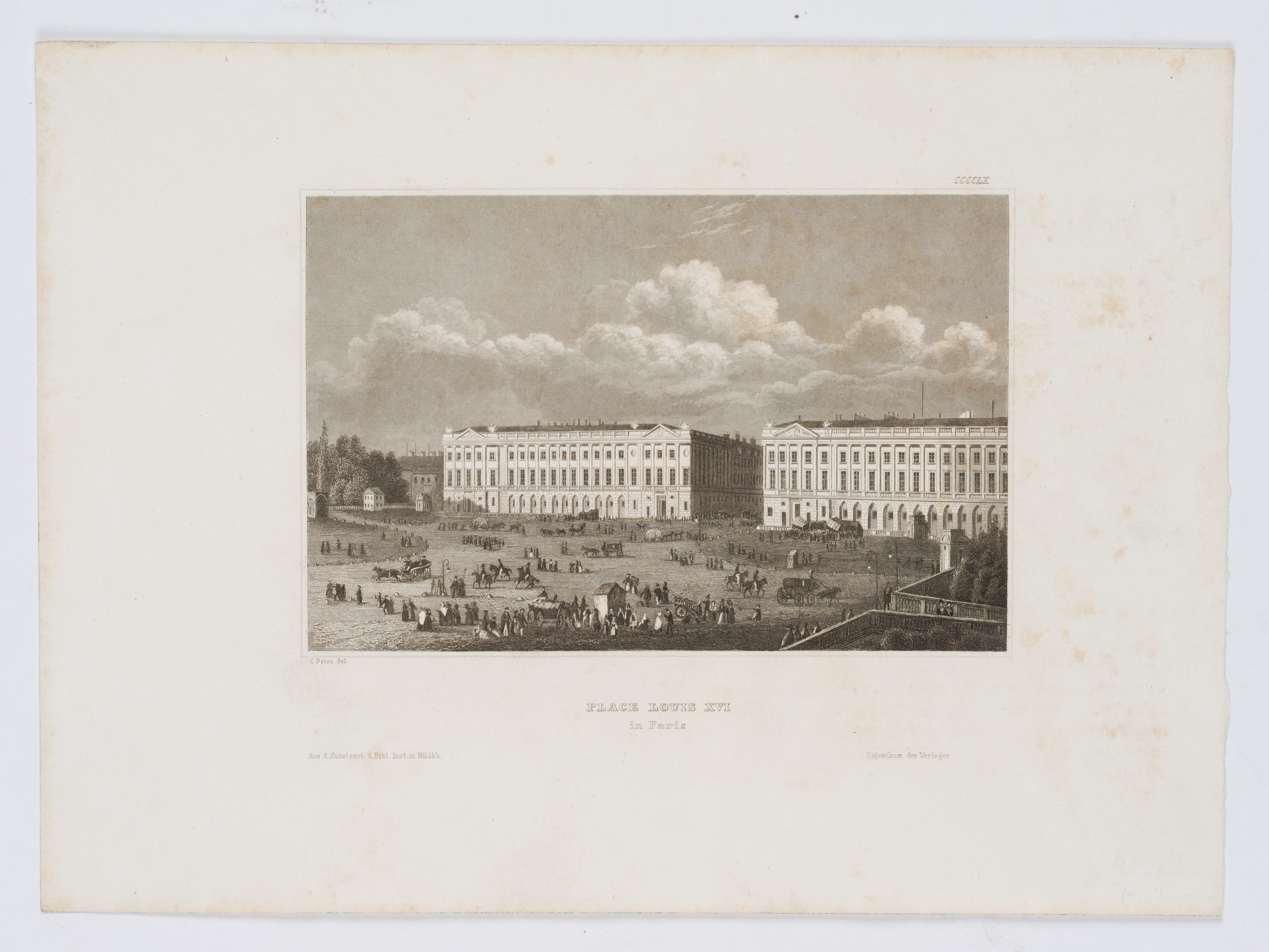 - Bezeichnung: Unten links im Druck signiert: “C. Reiss del.”. Unten im Druck bezeichnet: “Place Louis XVI in Paris”.