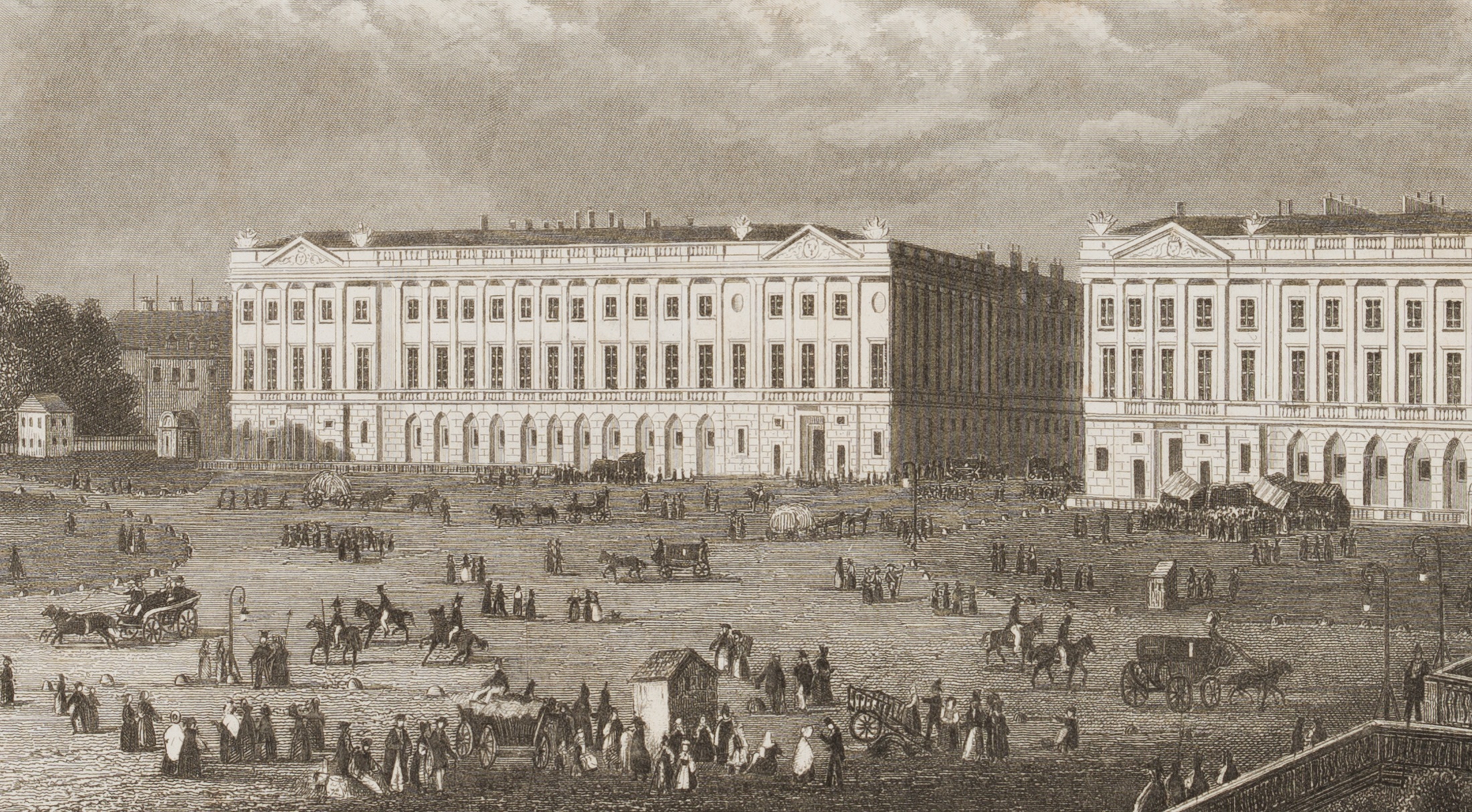 - Description: View of the spacious square in Paris with classical facades. In the foreground, figures in fashions typical of the place and time.