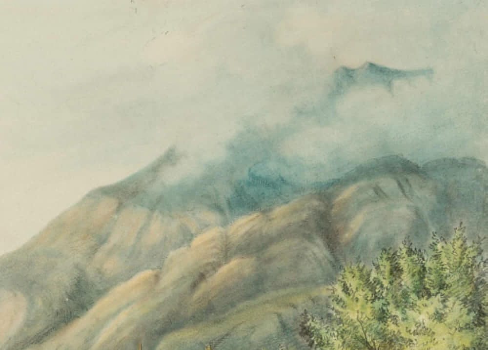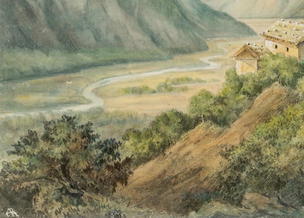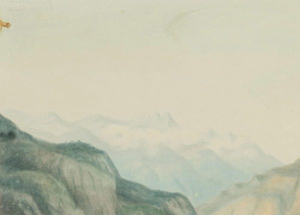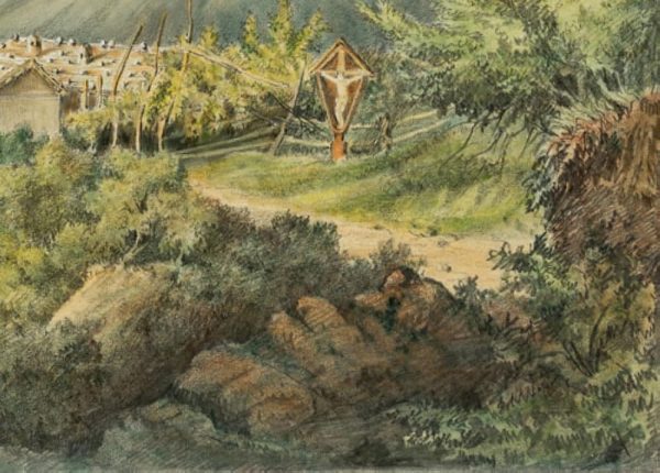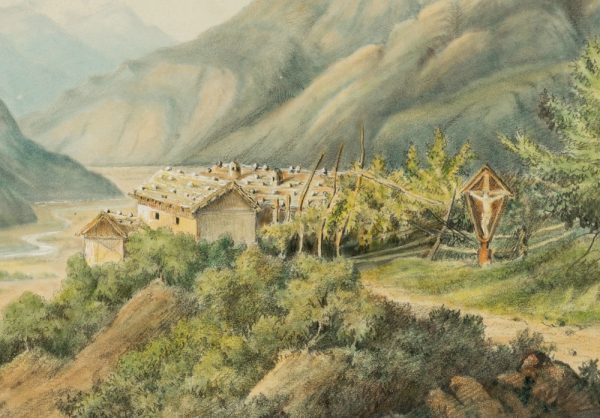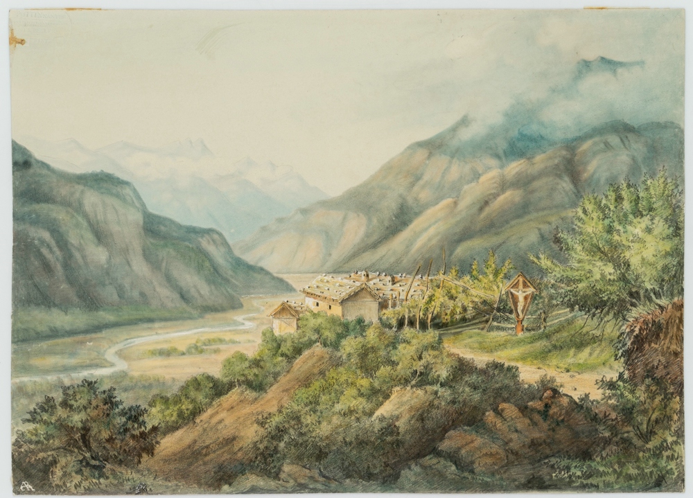 - Description: Successful landscape painting with a view from an elevated plain into a deep river valley in the alpine mountains. On the artist’s standing plane a small farmstead with a prominent wayside cross can be seen. Perspective depth is achieved by skilful bluing and blurring of the contours. The artist’s monogram is scratched on the lower left.