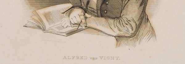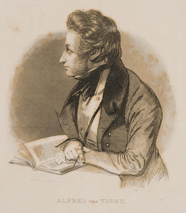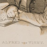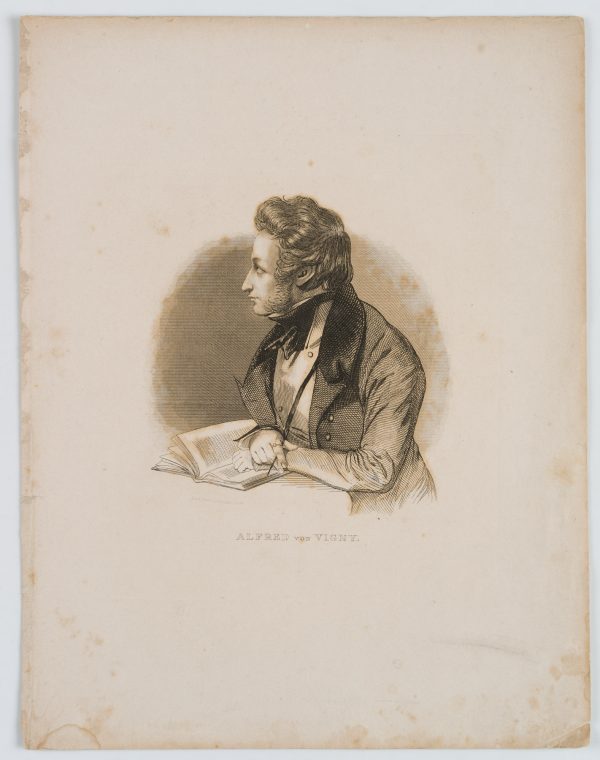 Carl Gottlieb Richter (19. Jahrhundert), Porträt des Alfred de Vigny (1797 Loches – 1863 Paris), frz. Schriftsteller der Romantik, Hüftportrait im Profil an einem Schreibtisch mit Buch und Feder sitzend, 19. Jahrhundert, Stahlstich