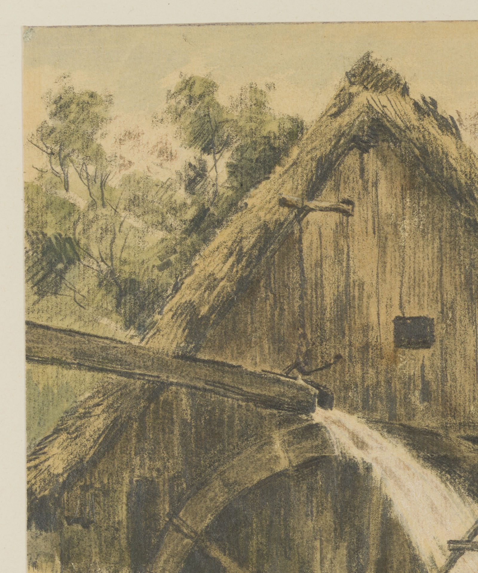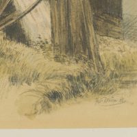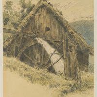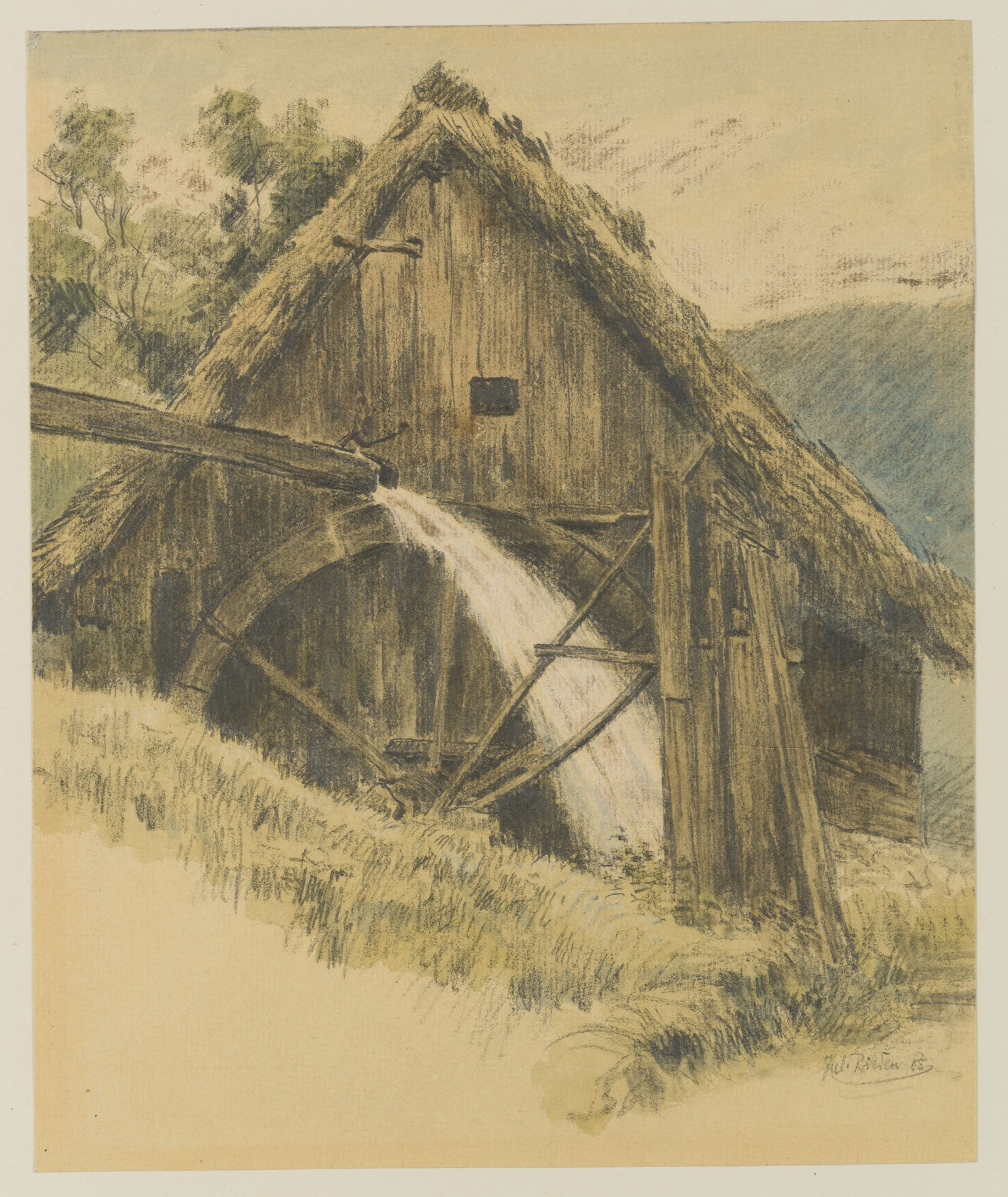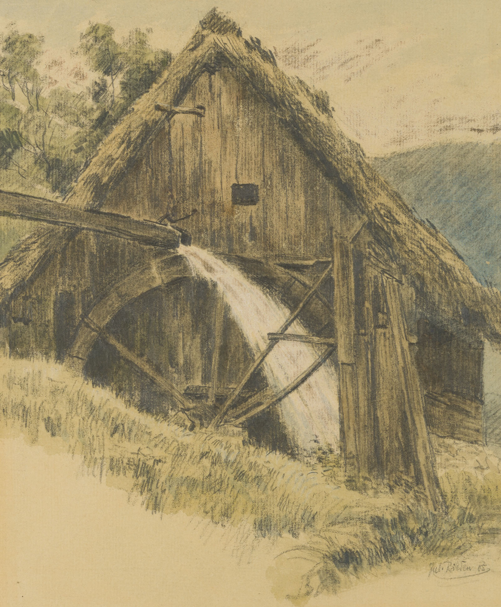 Carl Julius Rieden (*1802 Schmiedeberg), Alte Mühle mit Wasserrad, 1858, Bleistift