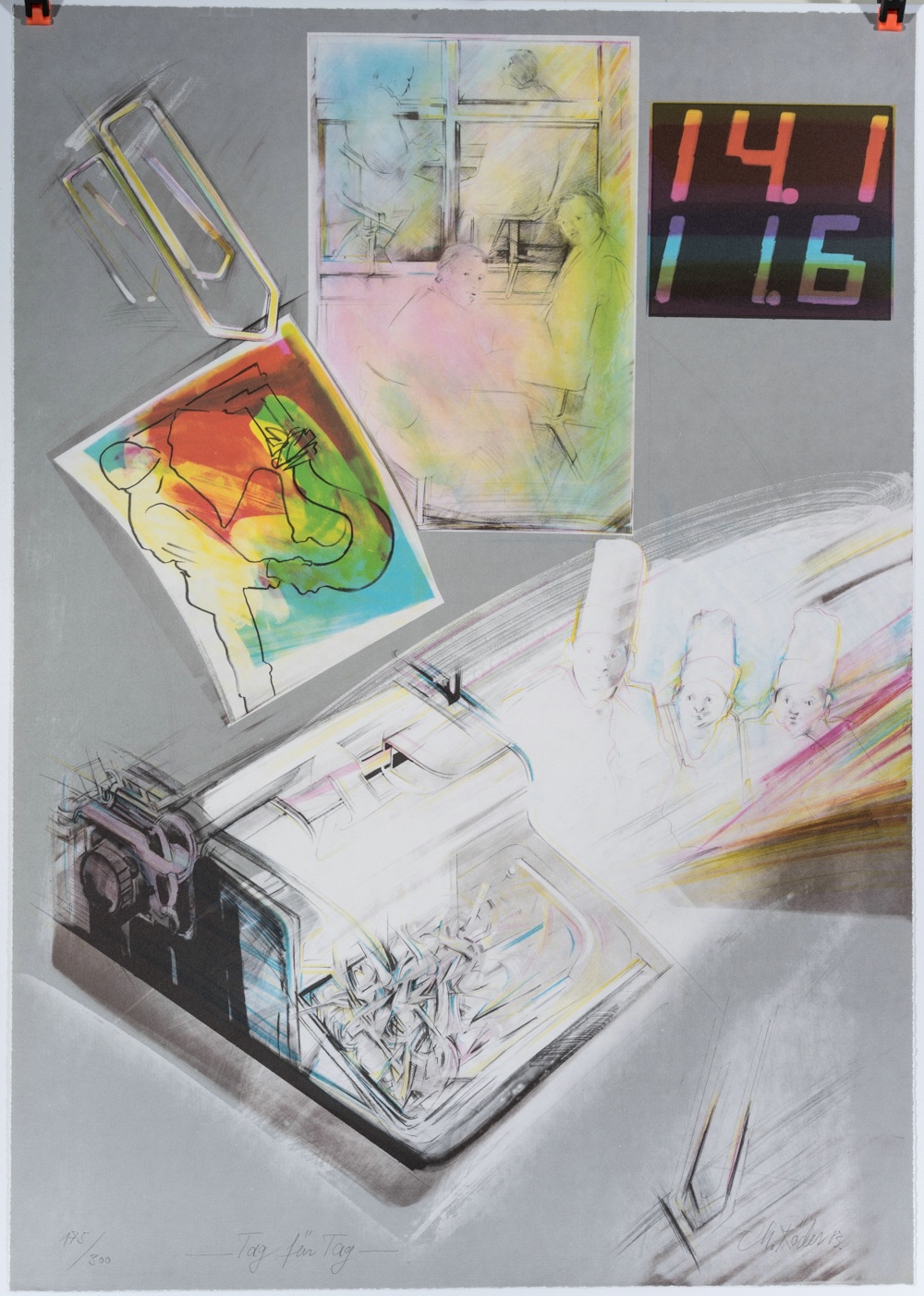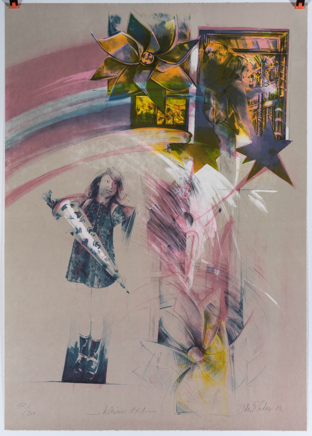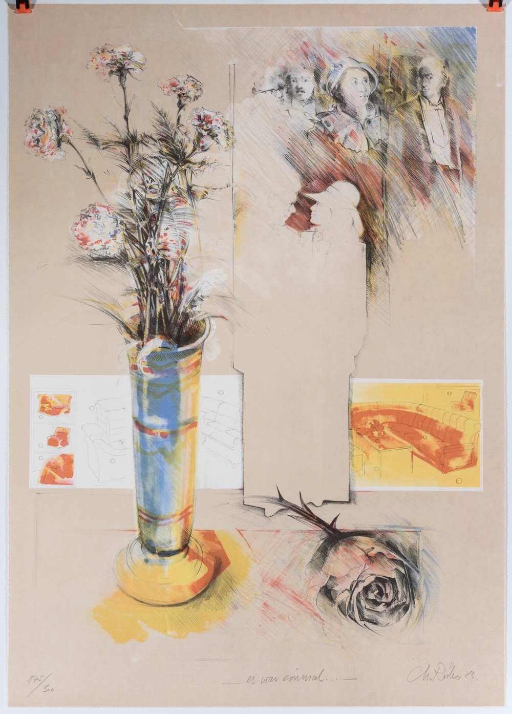 • Inscription: Numbered, signed and dated in pencil below: “175/300 | Ch. Röder 83” and titled: “-day by day-“, “-the heirs-“, “-collector’s luck-“, “-once upon a time..-” and “-small 1×1-“.