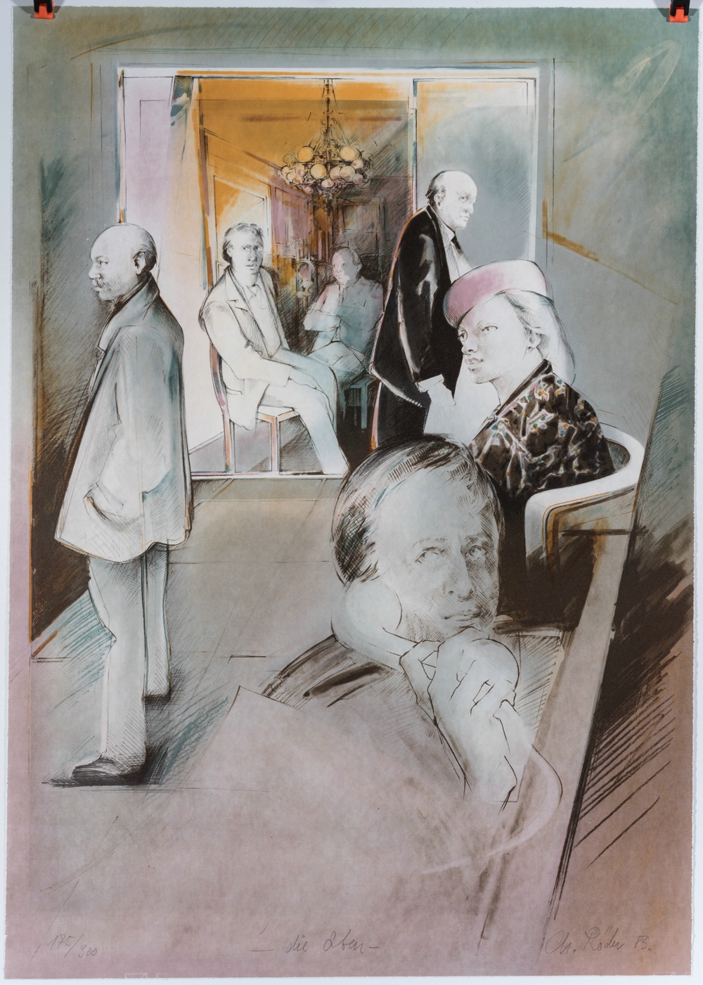Fünf moderne Farbdrucke der originalen Zeichnungen auf Papier in der originalen Mappe. Fünf großformatige Collagen unterschiedlichen Themas: Stillleben, Porträt, Gesellschaft. Skizzenhafte Darstellungen in freundlichen Pastelltönen.