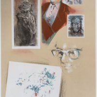 • Description: Five modern colour prints of the original drawings on paper in the original portfolio. Five large-format collages of different themes: still life, portrait, society. Sketchy representations in friendly pastel shades.
