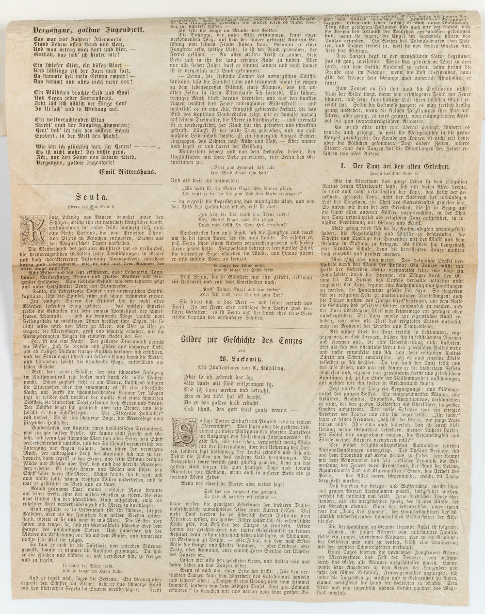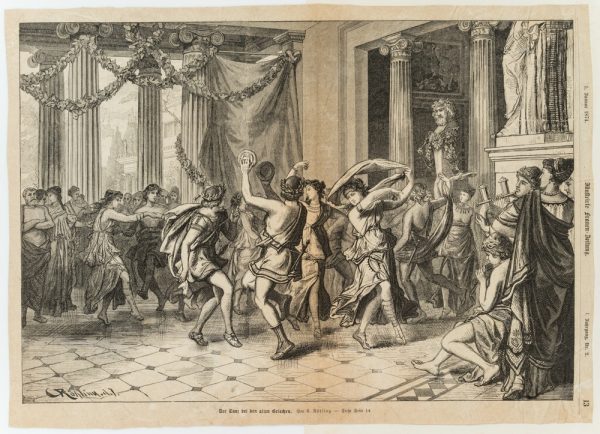 - Description: Exuberant anitcising festival scene. Depicts the idea of a debauched bacchanal in ancient Greece with musicians and dancers. The sheet is from the “Illustrierte Frauen-Zeitung” of 5 January 1874.