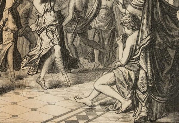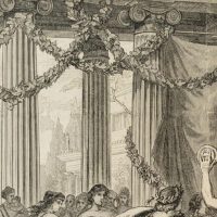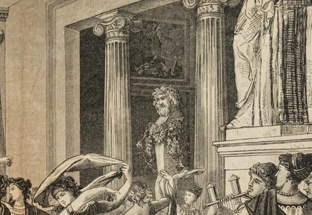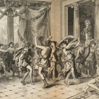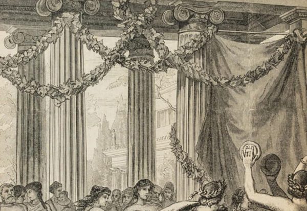 - Beschreibung: Ausgelassene anitkisierende Festszene. Zeigt die Vorstellung eines ausschweifenden Bacchanals im antiken Griechenland mit Musikanten und Tänzern. Das Blatt stammt aus der “Illustrierte Frauen-Zeitung” vom 5. Januar 1874.