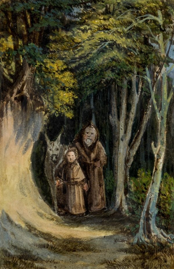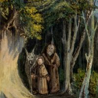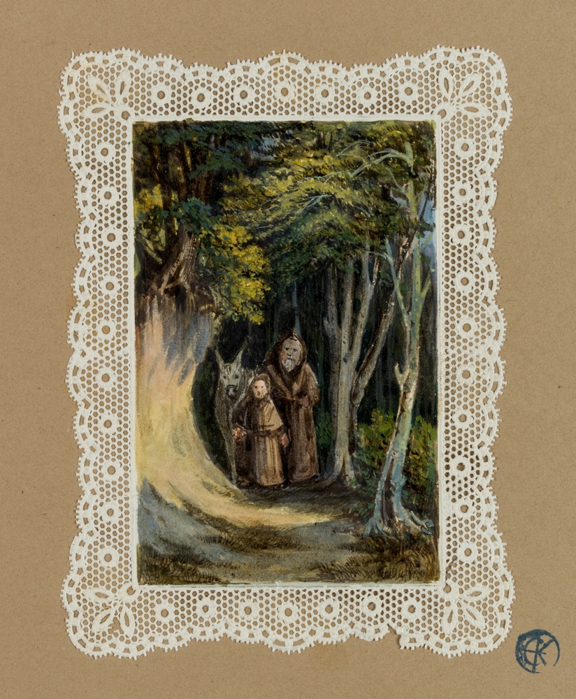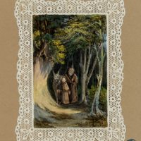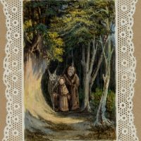 - Beschreibung: Auf einem schmalen Weg durch den Wald wandern ein Mönch und ein junger Novize in braunen Kutten mit einem Esel.