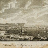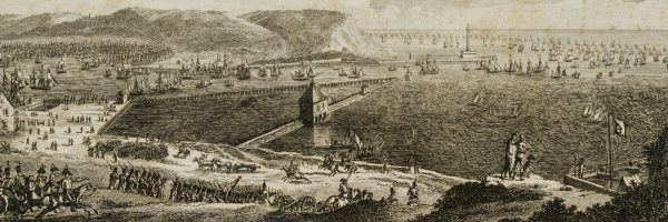 - Description: View of the French port city of Boulogne-sur-Mer in the north of France. In the foreground, military units can be seen striding towards the sea. Then on the shore numerous boats, in the middle ground whole formations of warships just leaving the harbour. The depiction refers to Napoleon’s planned invasion in 1804, when he assembled an army of 150,000 men on the Channel coast near Boulogne. Numerous transport ships were built to carry out the crossing. In August 1805, however, the camp at Boulogne was broken off due to the opening of the war by Austria and the French army was moved in rapid marches to the Danube.