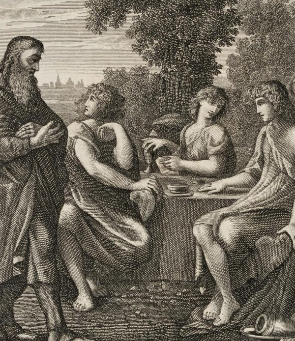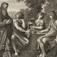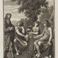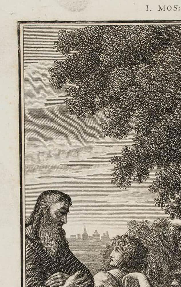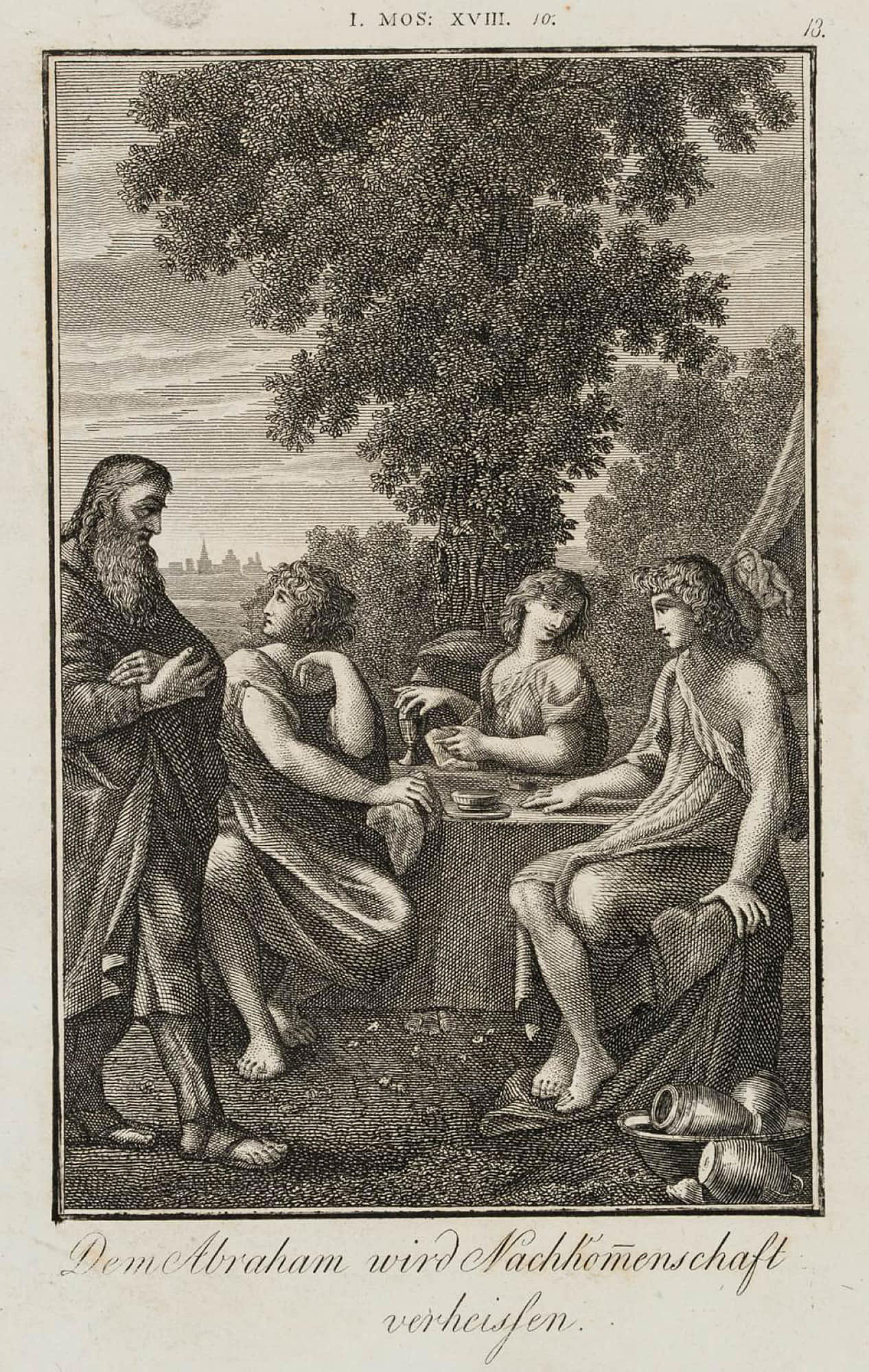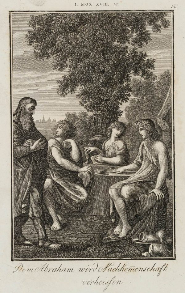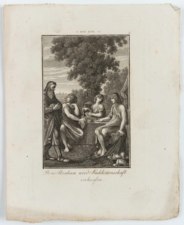 - Description: Inscribed above and below the depiction in the printing plate. Showing a scenic depiction of Abraham with his sons. Abraham is considered the progenitor of the three world religions Christianity, Islam and Judaism. Illustration of the biblical passage Genesis 18:10. The illustration is from Die Heiligen Schriften des Alten Testaments in Hundert Biblischen Kupfern dargestellt | Gestochen unter der Leitung von Carl Schuler | Freiburg in der Herder’sche Kunst und Buchhandlung, published around 1820.