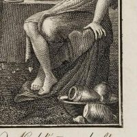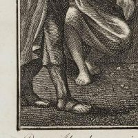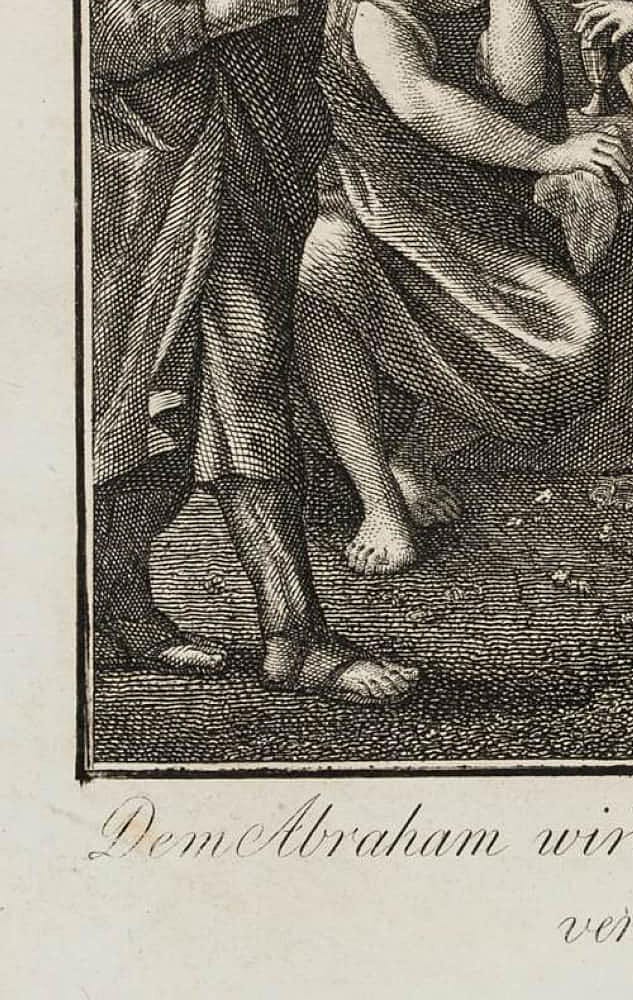 - Beschreibung: Oberhalb und unterhalb der Darstellung in der Druckplatte bezeichnet. Zeigt eine szenische Darstellung Abrahams mit seinen Söhnen. Abraham gilt als Stammvater der drei Weltreligionen Christentum, Islam und Judentum. Illustration zu der Bibelstelle 1. Buch Mose 18,10. Die Darstellung stammt aus Die Heiligen Schriften des Alten Testaments in Hundert Biblischen Kupfern dargestellt | Gestochen unter der Leitung von Carl Schuler | Freiburg in der Herder’schen Kunst und Buchhandlung, erschienen um 1820.