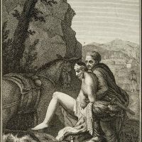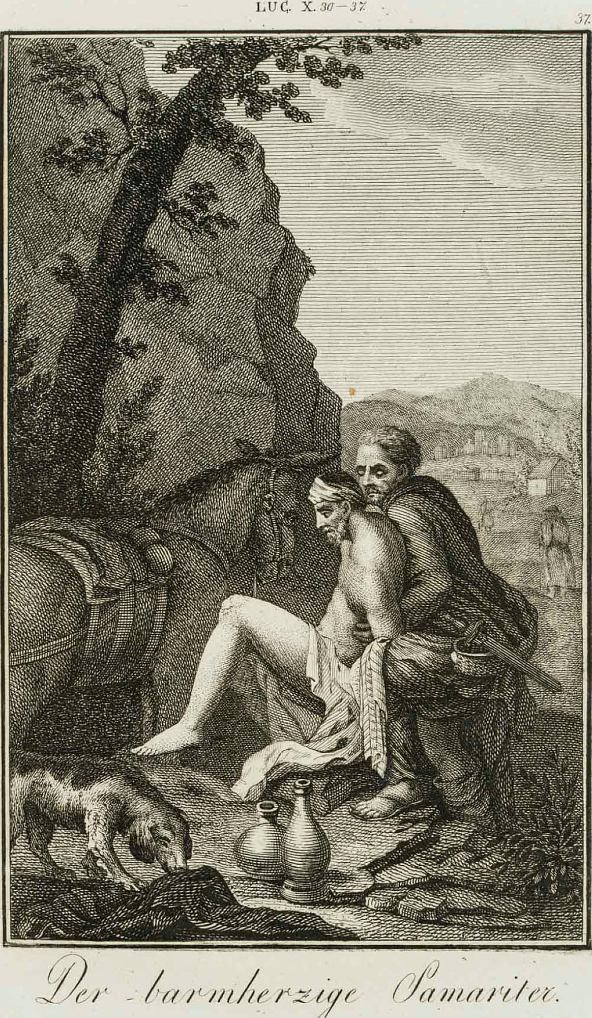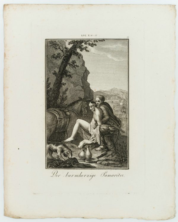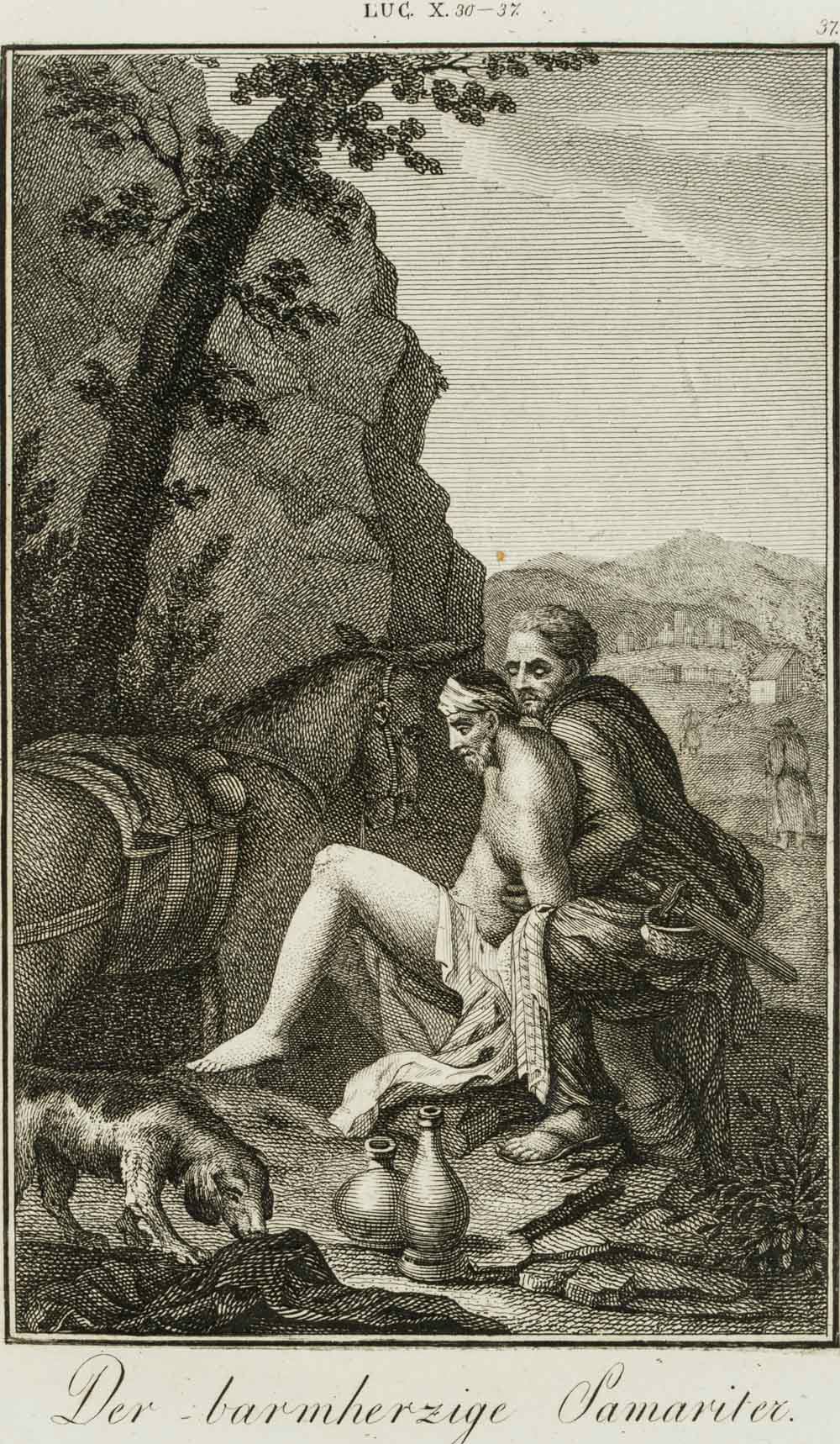 - Description: Showing a scenic depiction of the Samaritan helping a wounded man. Illustration of the biblical passage Luke 10:30-37. The illustration comes from Die Heiligen Schriften des Neuen Testaments in Hundert Biblischen Kupfern dargestellt | Gestochen unter der Leitung von Carl Schuler | Freiburg in der Herder’sche Kunst und Buchhandlung, published around 1820.