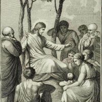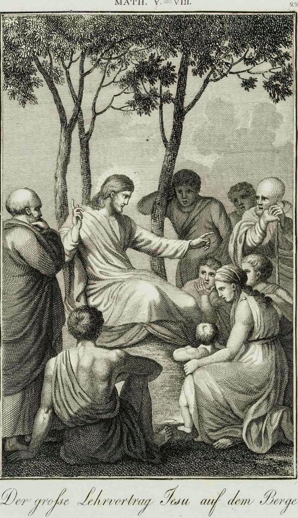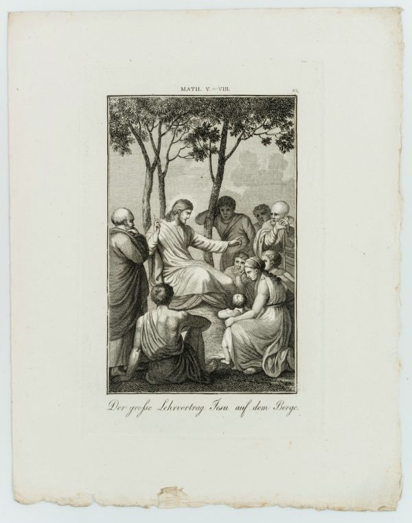 - Description: Shows a scenic depiction of Jesus proclaiming his teachings to the people. Illustration of the biblical passage Matthew 5-8. The illustration comes from Die Heiligen Schriften des Neuen Testaments in Hundert Biblischen Kupfern dargestellt | Gestochen unter der Leitung von Carl Schuler | Freiburg in der Herder’sche Kunst und Buchhandlung, published around 1820.