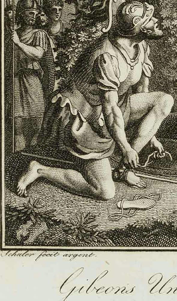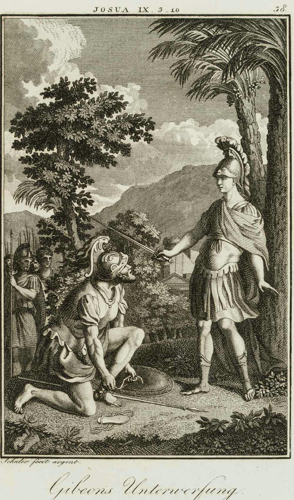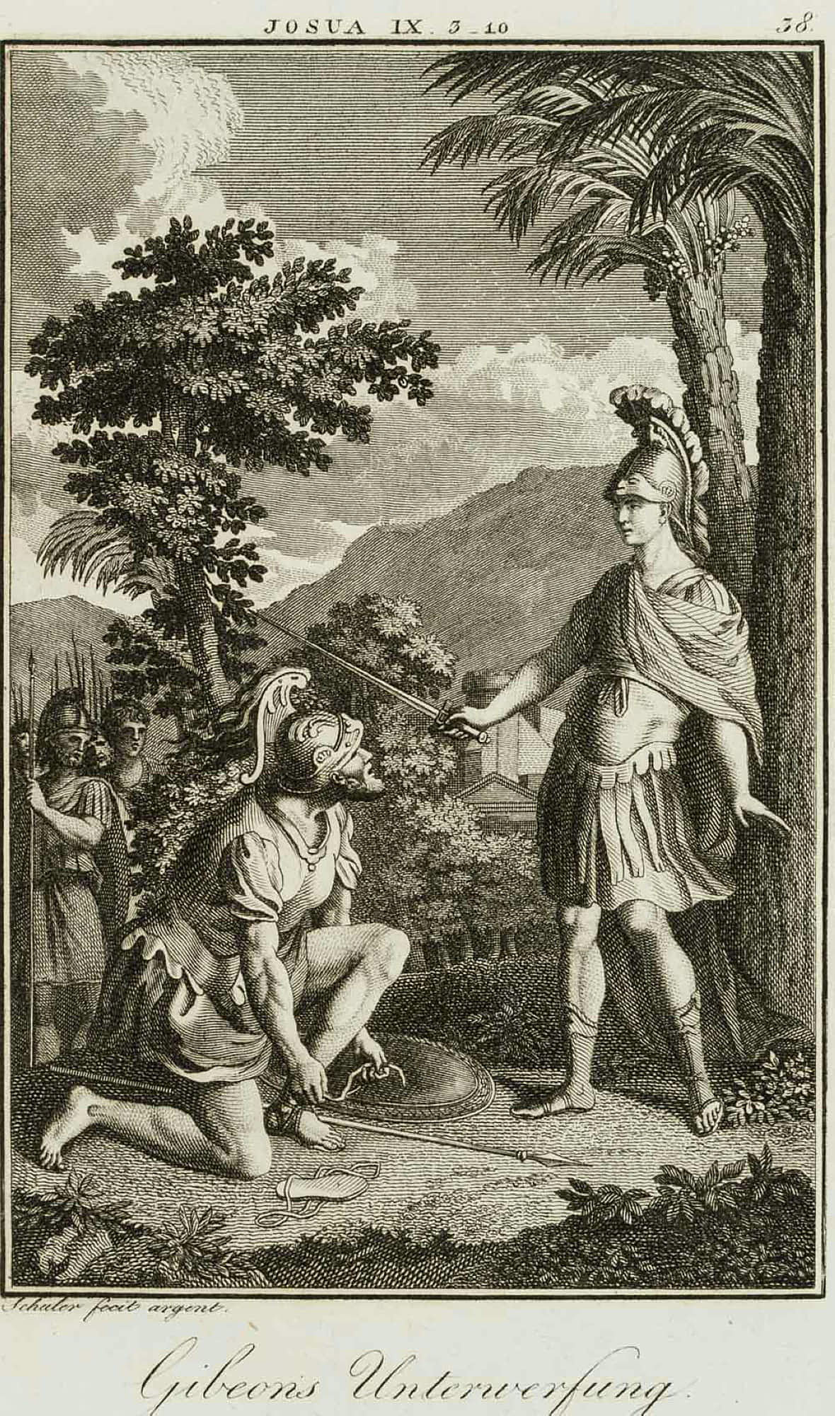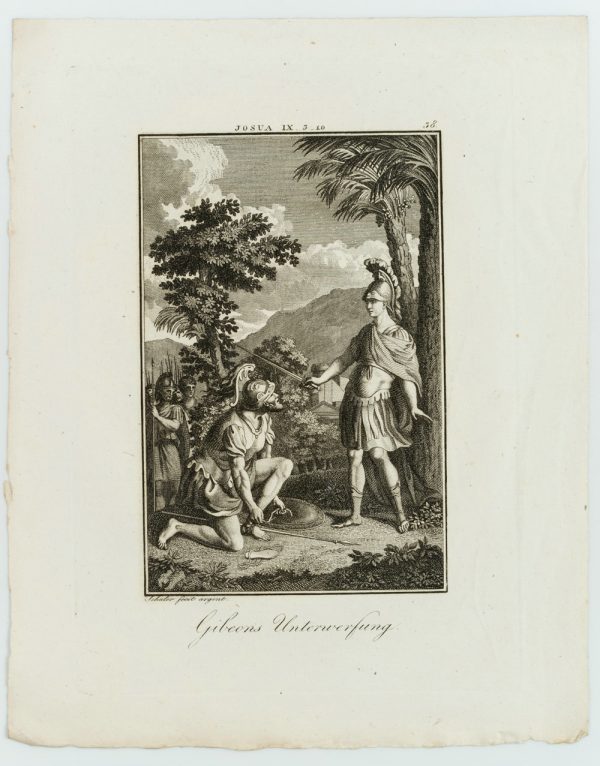 - Description: Shows a scenic depiction in which the leader of the Gibeonites submits to Joshua. Illustration of the biblical passage Jousa 9, 5-10. The illustration comes from Die Heiligen Schriften des Alten Testaments in Hundert Biblischen Kupfern dargestellt | Gestochen unter der Leitung von Carl Schuler | Freiburg in der Herder’sche Kunst und Buchhandlung, published around 1820.